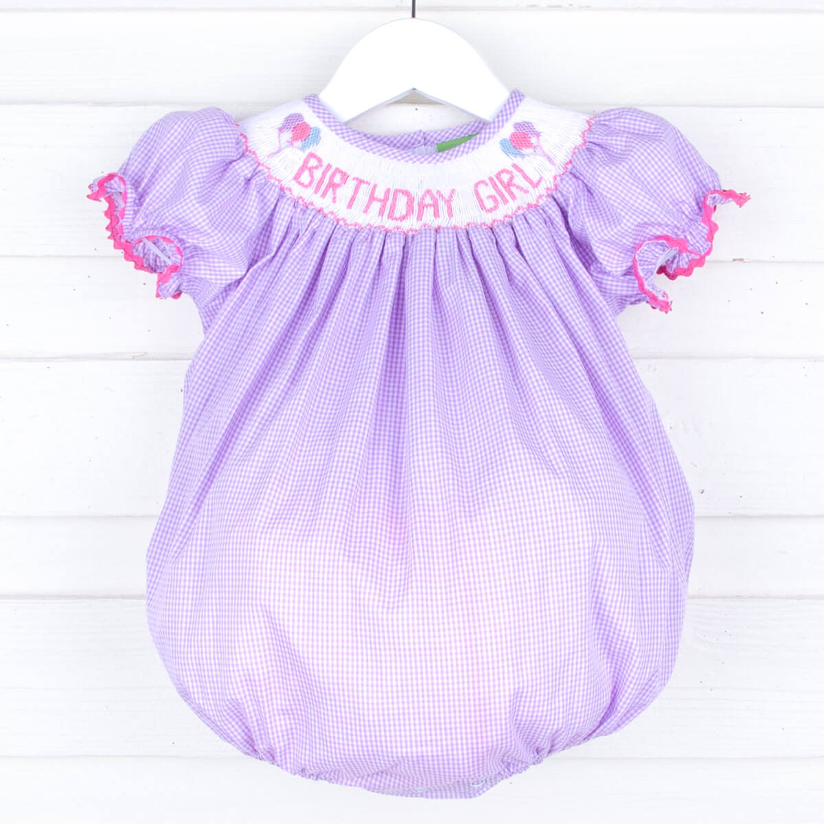 Celebrate your little one's birthday party in style with our Birthday Girl Smocked Bubble. This sweet lavender gingham bubble features hand-smocked "Birthday Girl" detailing. Adorable bishop sleeves with candy pink ric-rac trim add an extra touch of charm. Convenient snaps make dressing a breeze.