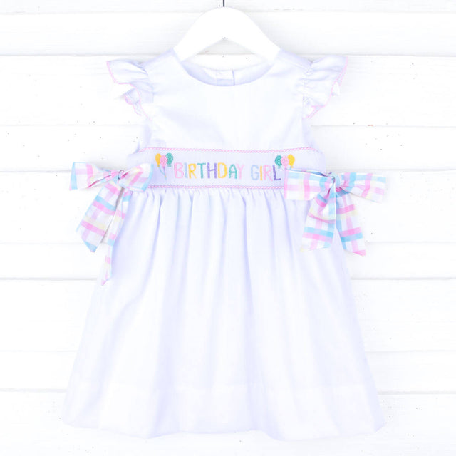 Absolutely adorable and perfect for your little one’s birthday celebration! This white Beverly-style dress features charming smocked 'Birthday Girl' and balloons, with sweet pastel plaid side-tie bows and convenient back buttons for easy dressing.