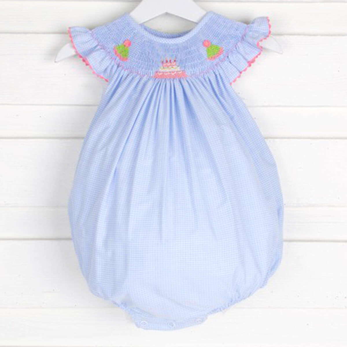 Celebrate your little one's Birthday party with our cute dress! Adorable hand-smocked party hats and a cake on this light blue gingham. Snaps in stride for easy chances.