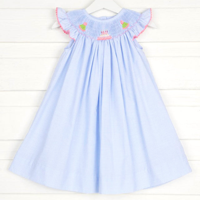 Celebrate your little one's Birthday party with our cute dress! Adorable hand-smocked party hats and a cake on this light blue gingham.