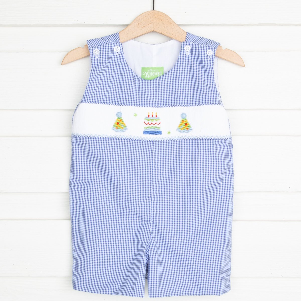 Celebrate your little one's special day in style with our Birthday Smocked Royal Jon Jon! Adorned with charming smocked cakes and party hats on a royal blue gingham fabric, it's perfect for the occasion. Designed with convenient shoulder buttons and snaps in stride for easy dressing