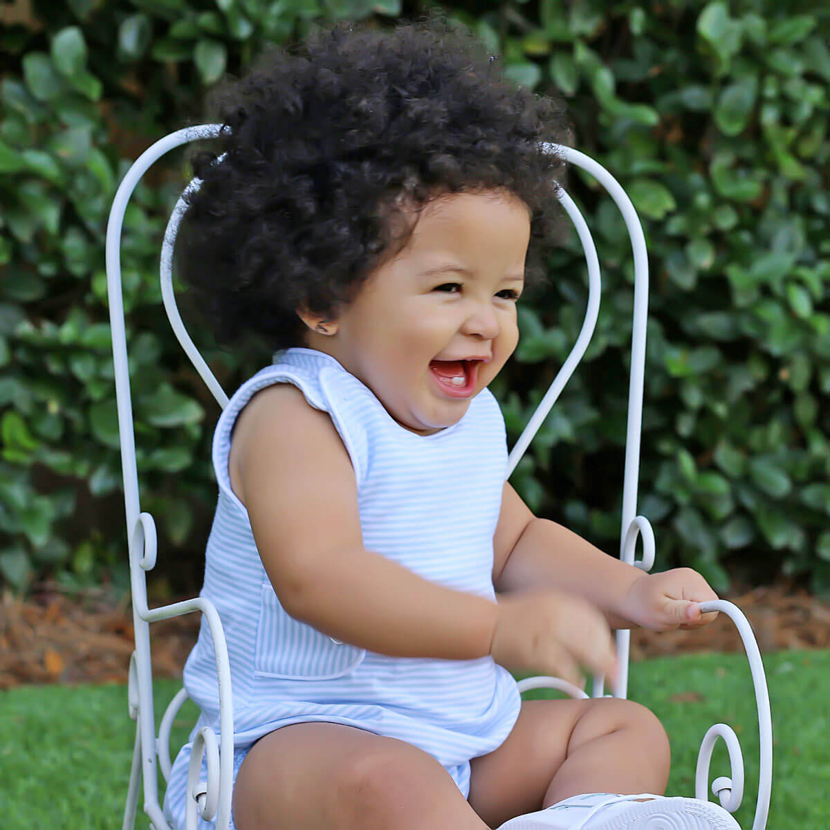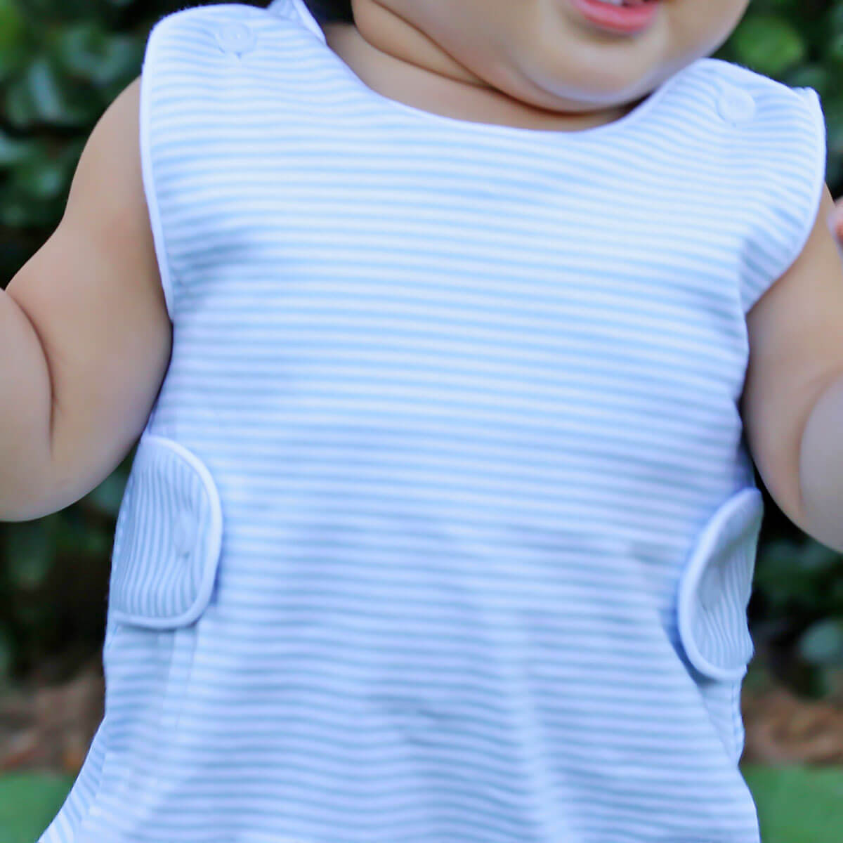 This Blue Stripe Sun Bubble is an adorable romper suitable for all seasons. It features a soft blue stripe knit fabric and a classic shoulder buttons. For a personal touch, consider adding a monogram to make it even more special. For easy diaper changes and dressing, the romper comes with convenient snaps in the stride. Whether it's for playdates, outings, or special occasions, this romper offers both comfort and style.