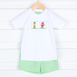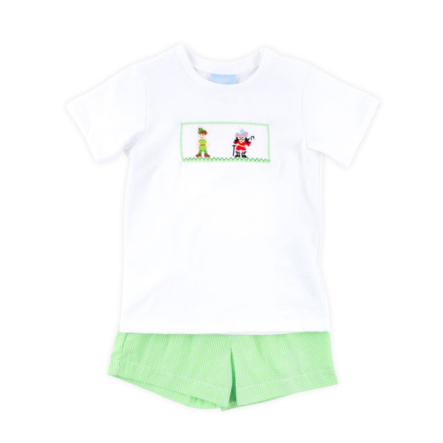 Experience enchanting moments with our Neverland Friends Smocked Short Set. A perfect choice for playdates, birthdays, or your next magical theme park visit. The white knit shirt features hand-smocked Peter and Captain Hook, adding a touch of whimsy to every moment. Paired with charming green gingham elastic waist pull-on shorts, this set ensures comfort and style for your little one's memorable adventures.