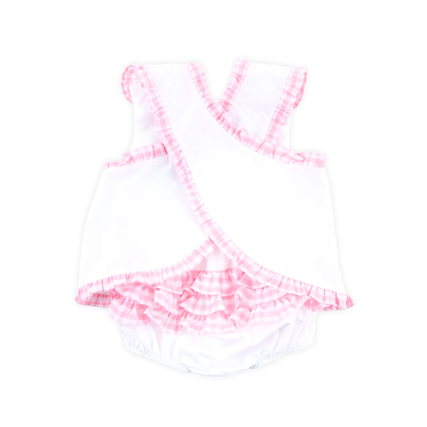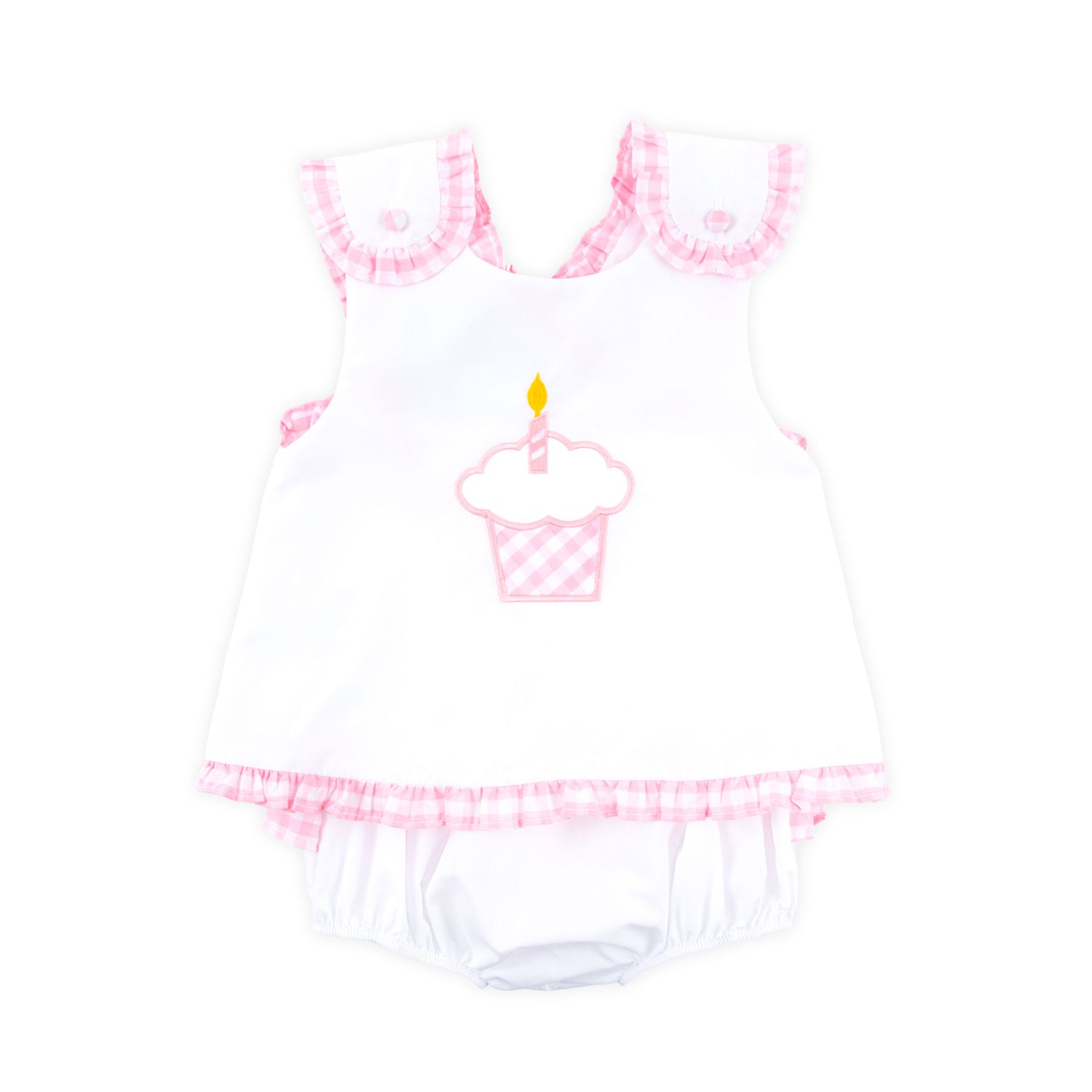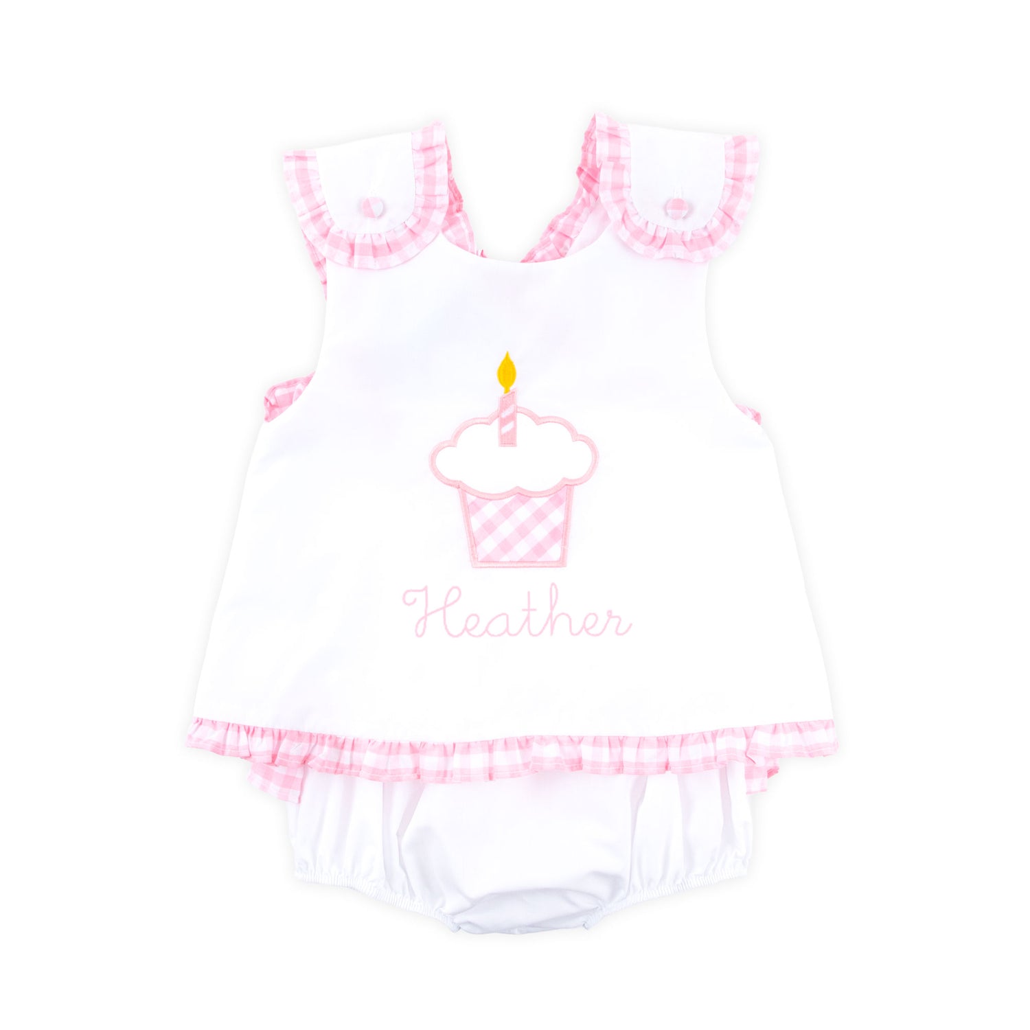 Your birthday girl needs this Cupcake Appliqué Popover Bloomer Set. The white top features wide straps with pink gingham check ruffle trim and the cutest cupcake appliqué. The set includes white bloomers with darling pink gingham trim. Make this outfit extra special by adding a monogram!
