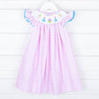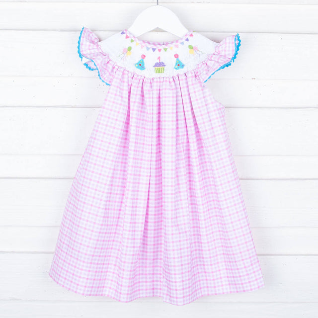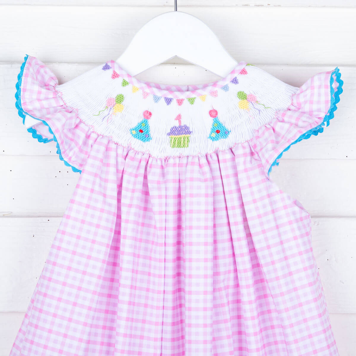 Celebrate your little one's birthday in style with our First Birthday Smocked Pink Check Dress. Adorned with charming smocked cupcakes and birthday hats, this pink check dress is the perfect blend of playful and elegant. Complete with flutter sleeves accented by turquoise ric-rac trim, it’s the ideal outfit for your special celebration.