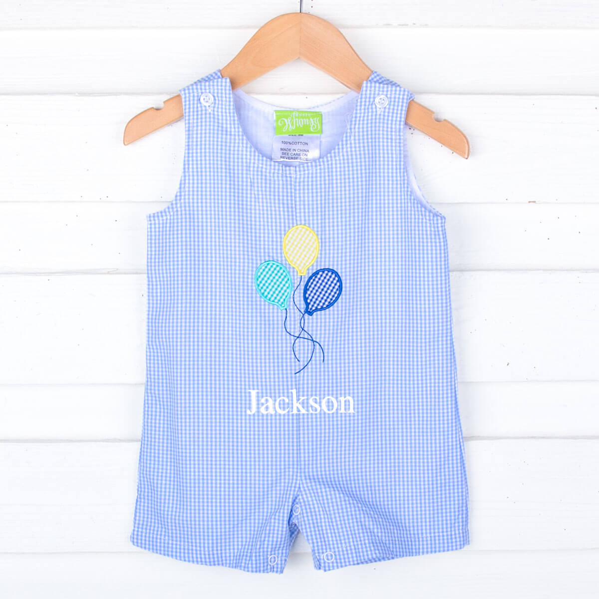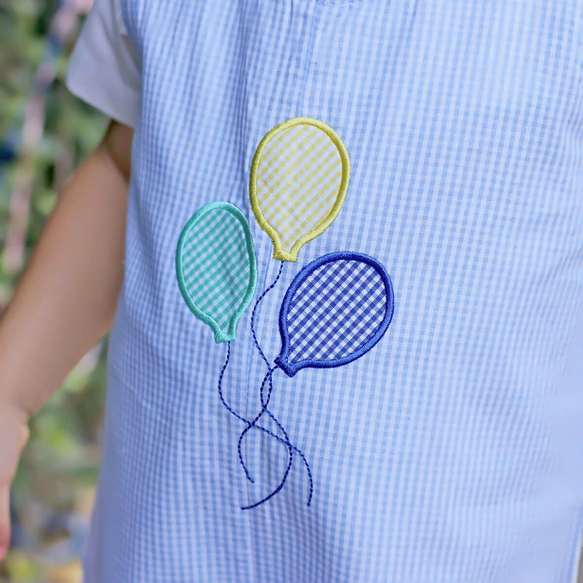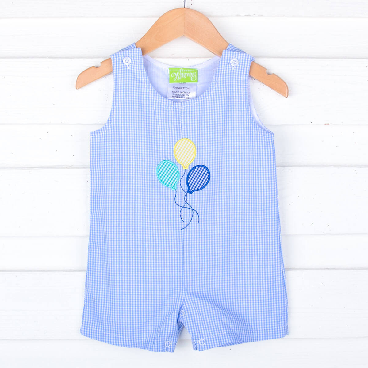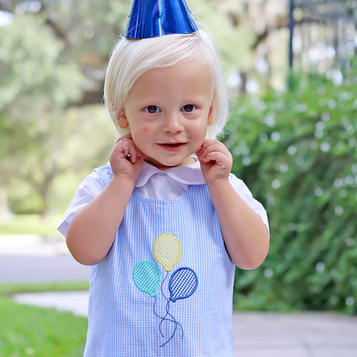 Happy Birthday!!! Celebrate your little one's milestone with our precious Let's Celebrate Jon Jon. This light blue gingham outfit features festive birthday balloons. Dressing is made easy with convenient shoulder buttons and snaps in stride. Elevate the joy by adding a monogram below the appliqué for a personalized touch, making their special day even more memorable!