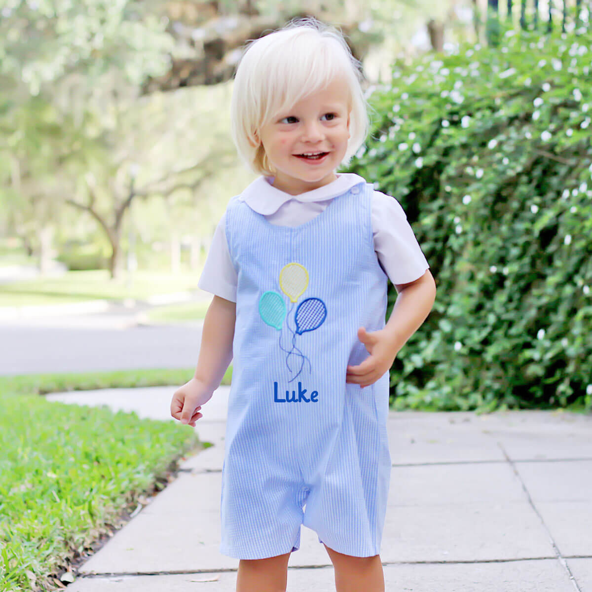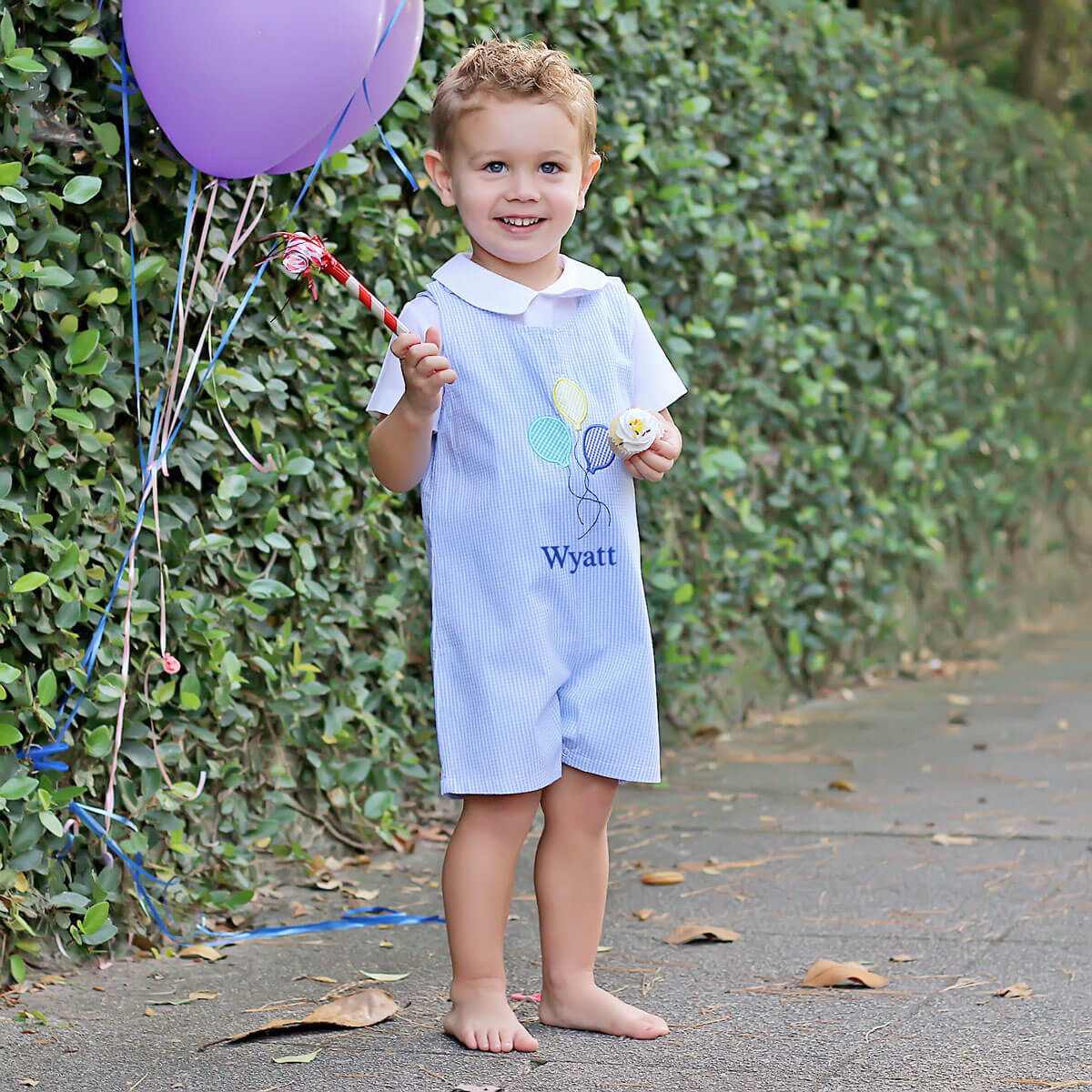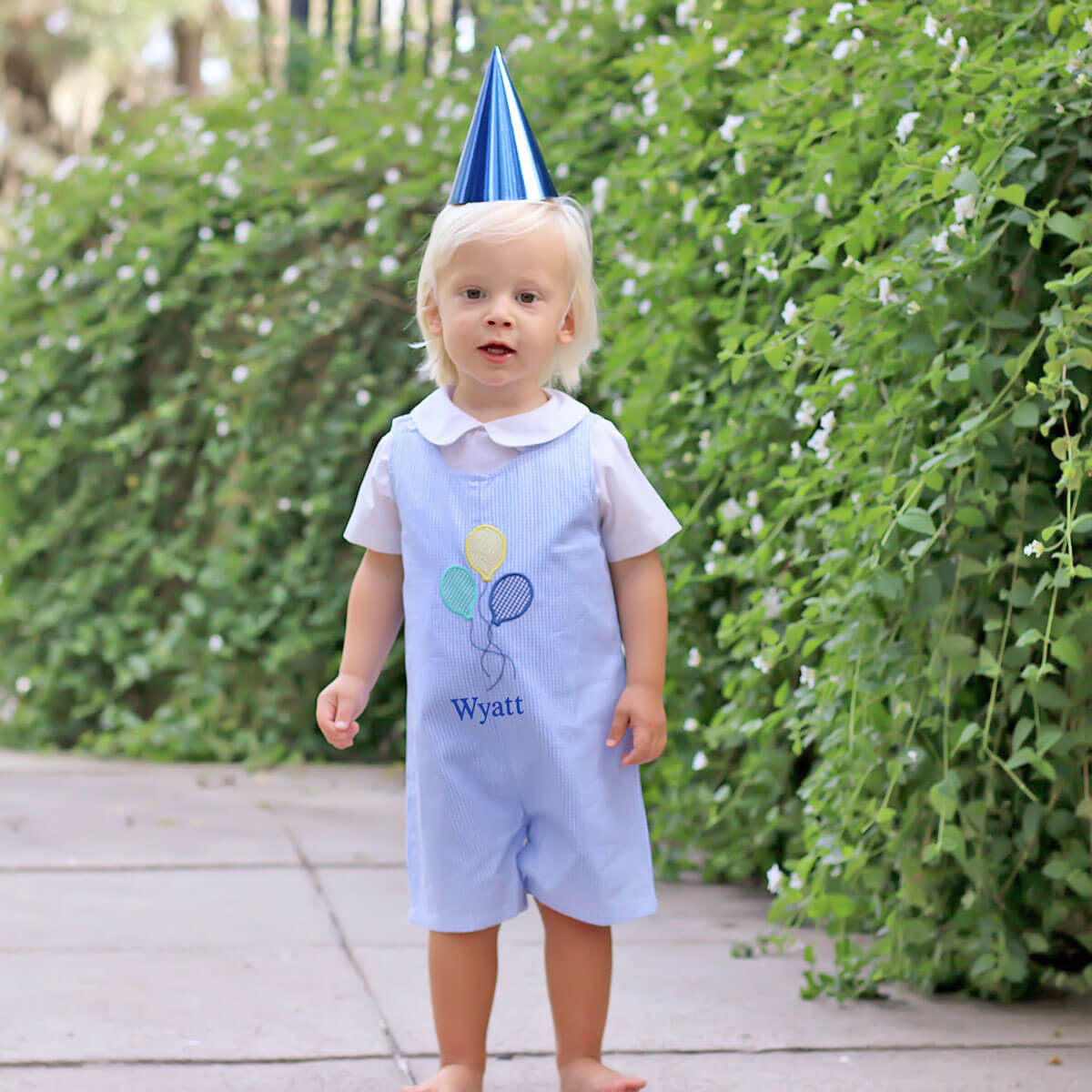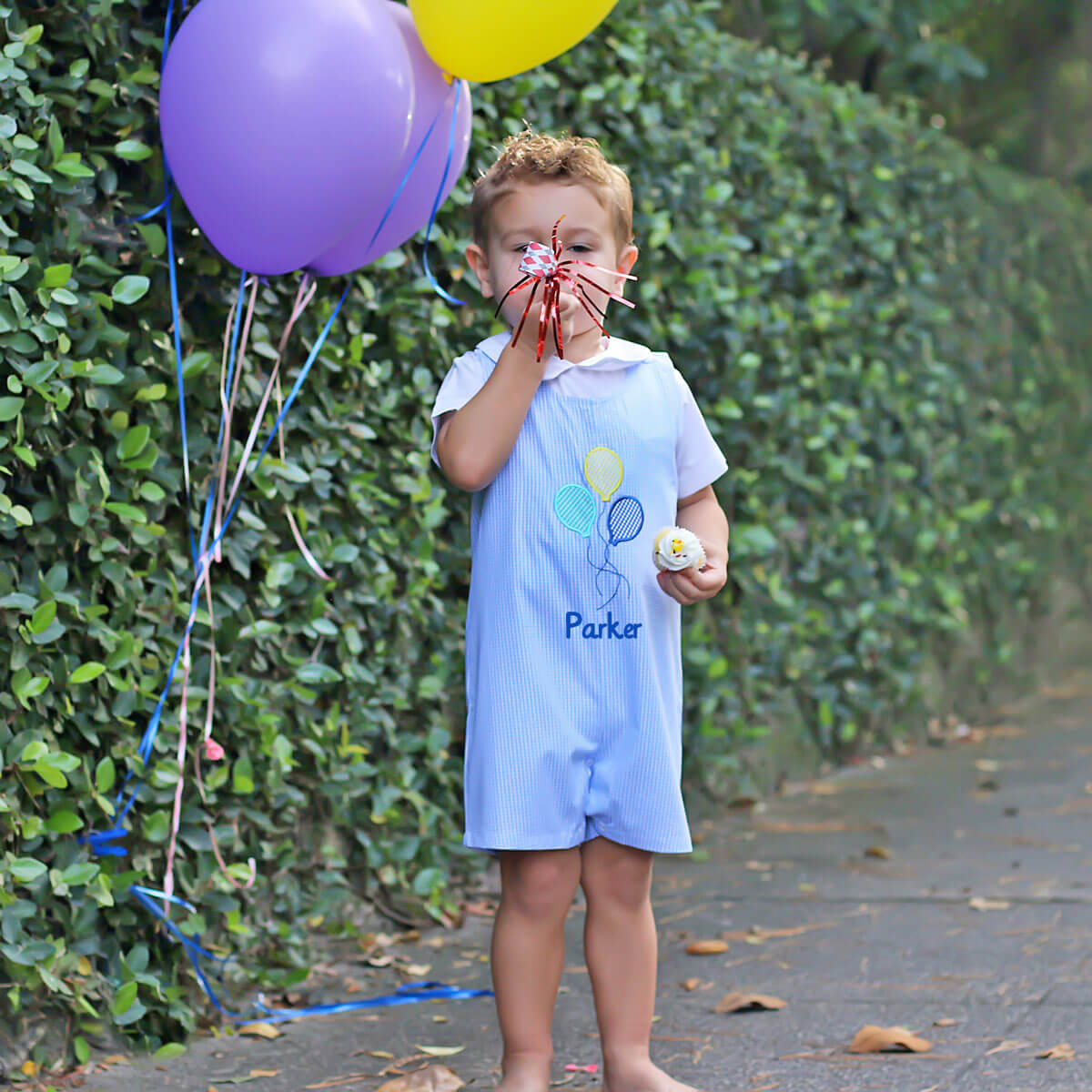 Happy Birthday!!! Celebrate your little one's milestone with our precious Let's Celebrate Jon Jon. This light blue gingham outfit features festive birthday balloons. Dressing is made easy with convenient shoulder buttons and snaps in stride. Elevate the joy by adding a monogram below the appliqué for a personalized touch, making their special day even more memorable!