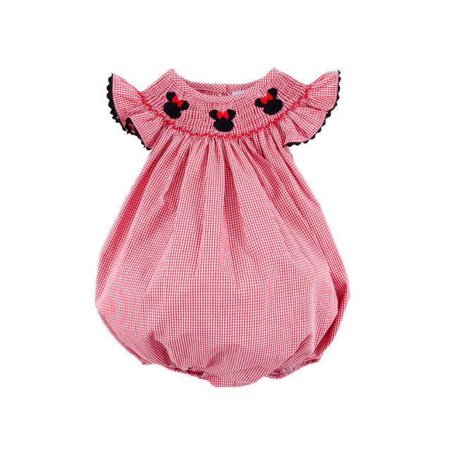This Magical Mouse Ears Bubble is a unique look for your next magical vacation! Features hand-smocked mouse ears with cute red bows on a red gingham. Adorable flutter sleeves with black ric-rac trim and snaps in stride.