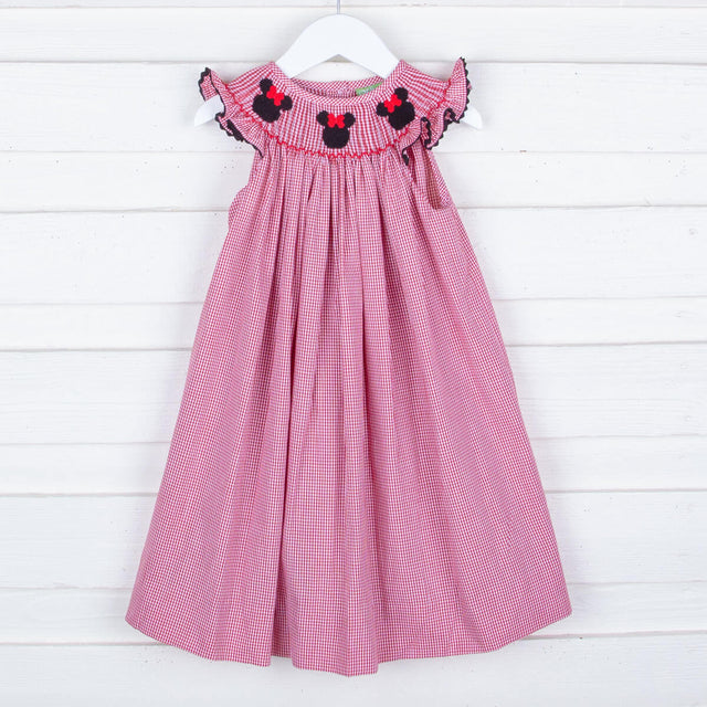 This Magical Mouse Ears Dress is a unique look for your next magical vacation! Features hand-smocked mouse ears with cute red bows. Adorable flutter sleeves with black ric-rac trim.