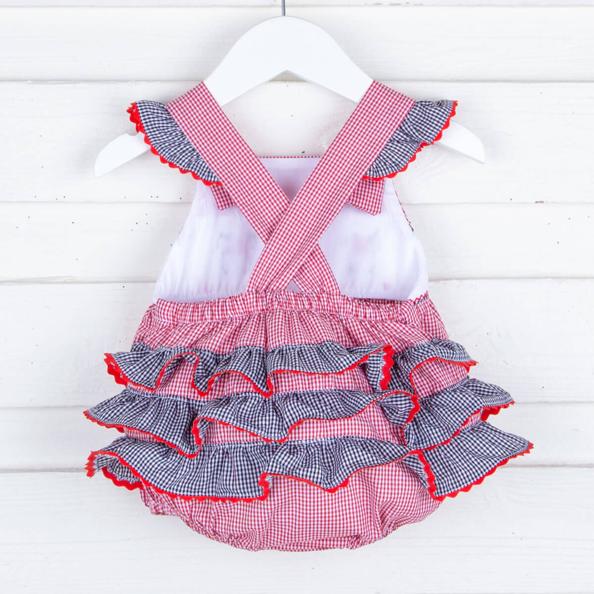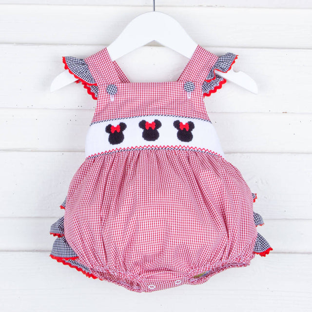 This adorable ruffle bubble is perfect for your little one all season long! The Leah style bubble features hand-smocked mouse ears on a red gingham fabric. Features the sweetest back ruffles and snaps in stride.