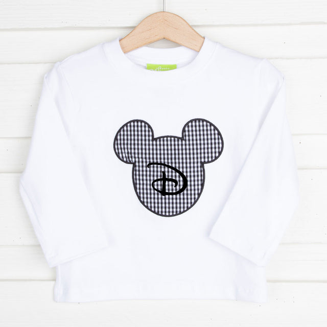This adorable white long sleeve knit shirt features a black gingham mouse ears appliqué. Add a monogram in your favorite font. Check out coordinating sibling outfits for a totally coordinated trip to the Happiest Place on Earth!