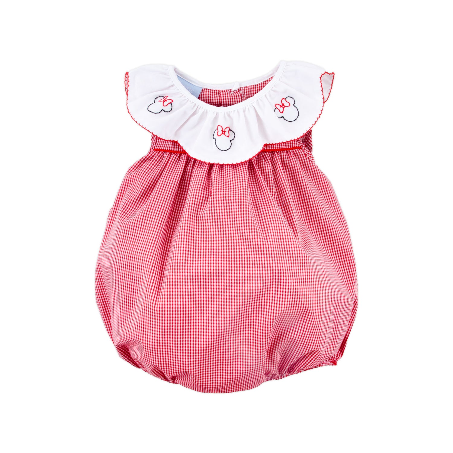This adorable hand-embroidered Mouse Ears Quinn Bubble is a must for your baby or toddler girl's next fairytale vacation! Classic red gingham bubble outfit with scallop collared neckline featuring darling shadow embroidered mouse ears with that quintessential red bow! Snaps in stride.