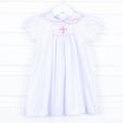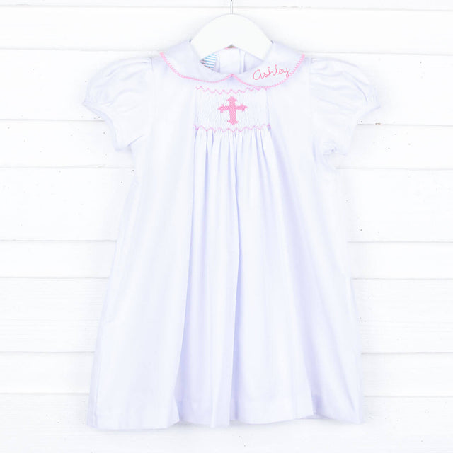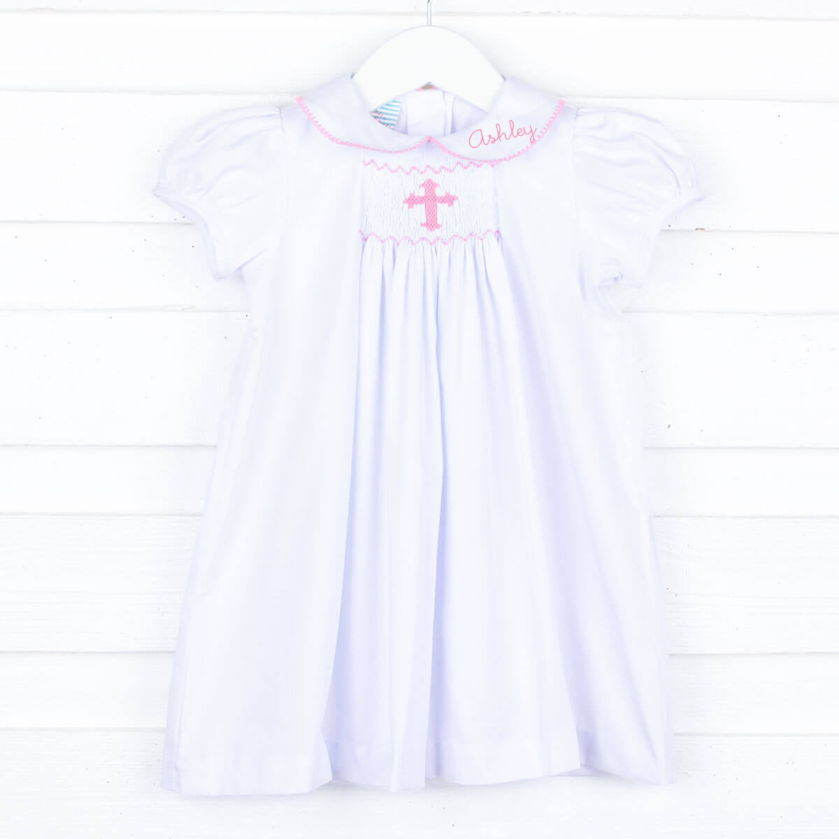 Darling for your little girl's special occasion at church, Easter, baptism or christening. This solid white pique dress features a single hand-smocked pink cross in the center. We love the cute collar and puff sleeves with pink trim. Back buttons for closure.