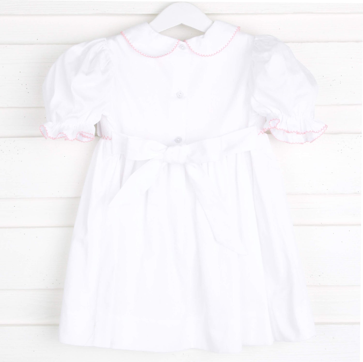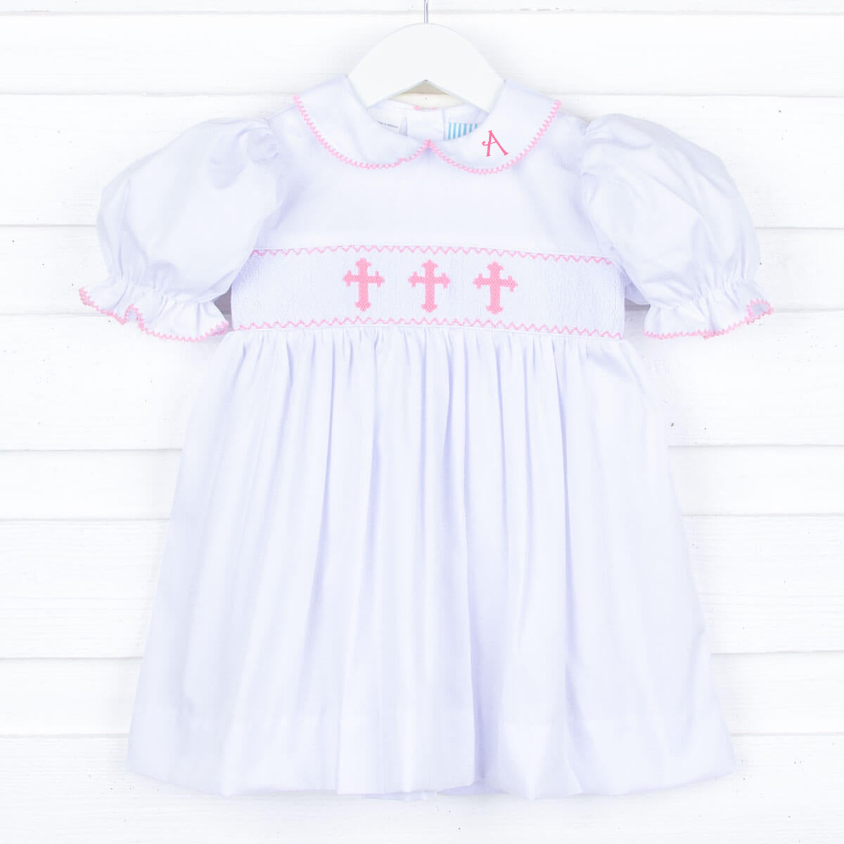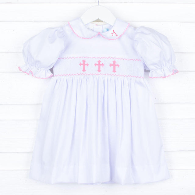 Darling for your little girl's special occasion at church, Easter, baptism or christening. Features hand-smocked pink crosses on a solid white pique fabric. Also features a cute collar and bishop sleeves with a pink trim. Tie back sash and back buttons for closure.