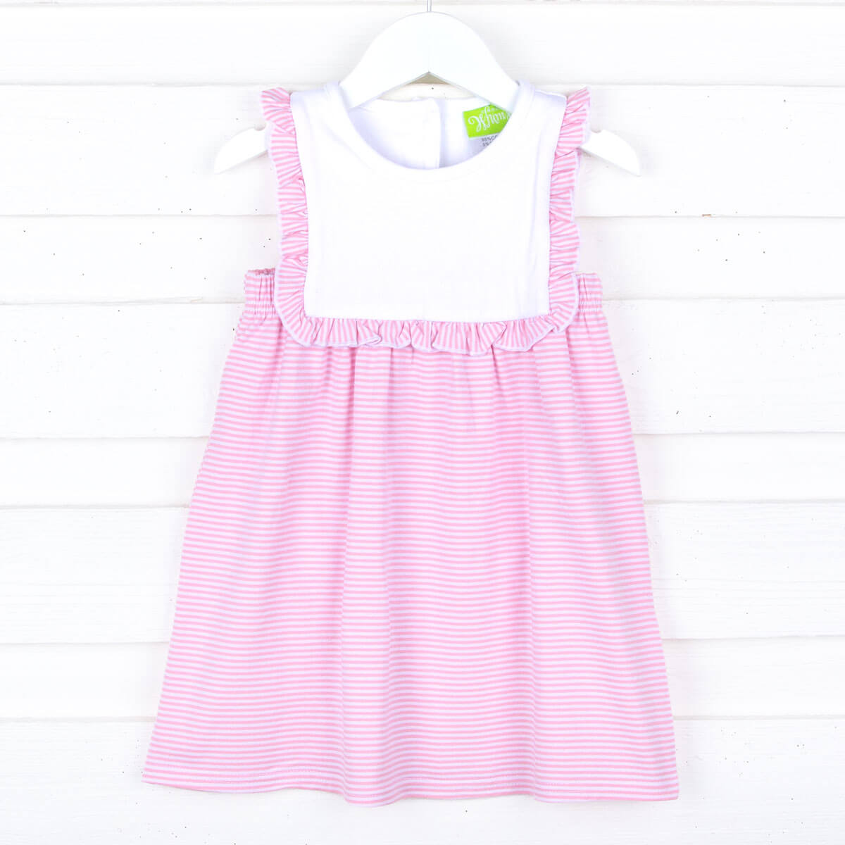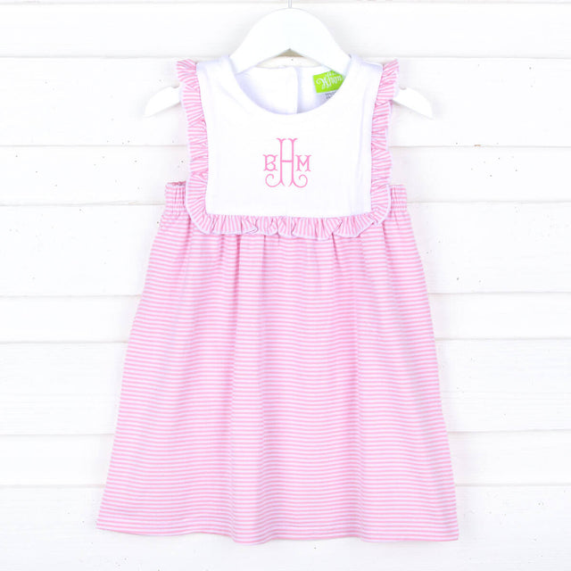 This Pink Stripe Bib Dress is an irresistible choice for any season. The pink stripe design adds a playful touch to your little one's outfit. The white bib with ruffle detailing provides an extra touch of charm. You can make it even more special by adding a monogram to create a personalized look