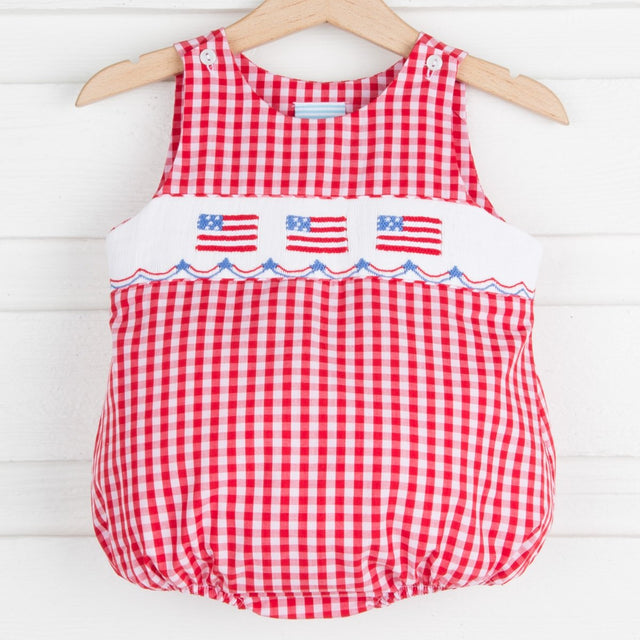We love celebrating the 4th of July! Add the Red Check American Flag Smocked Sun Bubble to your festivities. This red gingham bubble features smocked flags, perfect for all the holiday fun. Shoulder buttons and snaps in the stride make for easy changes.