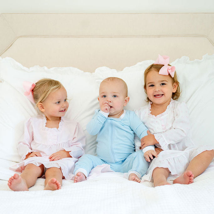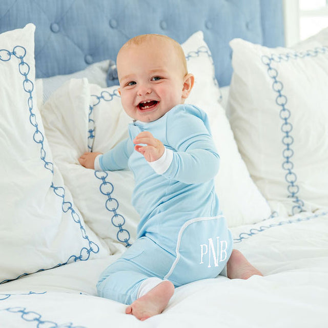 Your little one will be comfortable dreaming in this Solid Blue Zip Sleeper. The blue knit onesie is the softest and most comfortable for your little one! Perfect for all seasons! Easy zip-up front zipper! Back flap is sewn down. Selected sizes available footed & footless. Makes the perfect baby gift!