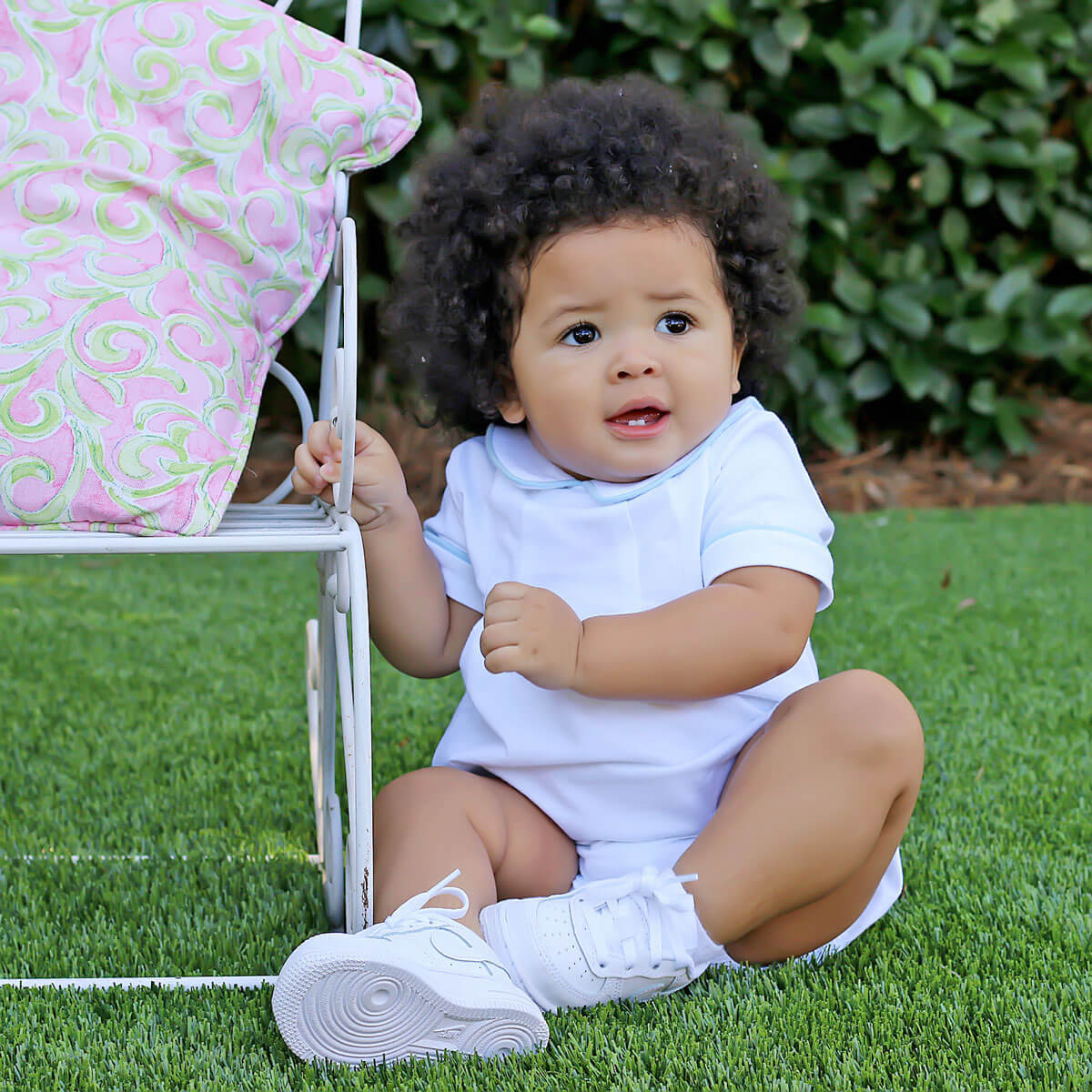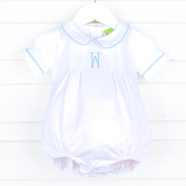 This Solid White Collared Bubble with Blue Trim is an adorable boy's outfit suitable for all seasons. It features a classic Peter Pan collar and pleated details. For a personal touch, consider adding a monogram to make it even more special. For easy diaper changes and dressing, the romper comes with convenient snaps in the stride and buttons in the back. Whether it's for playdates, outings, or special occasions, this romper offers both comfort and style.