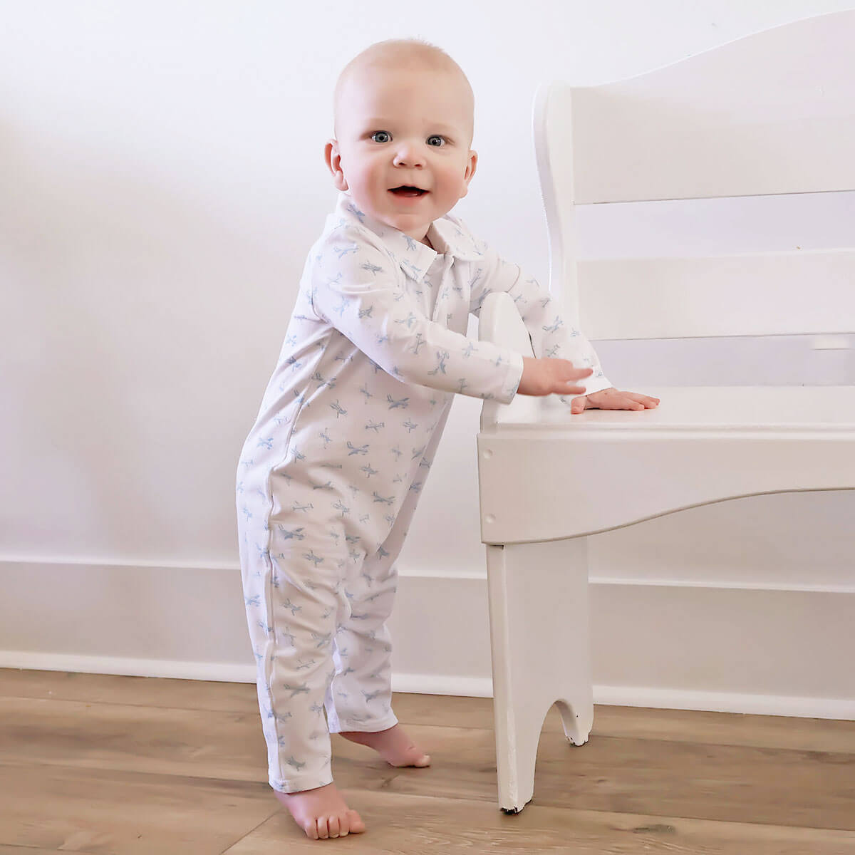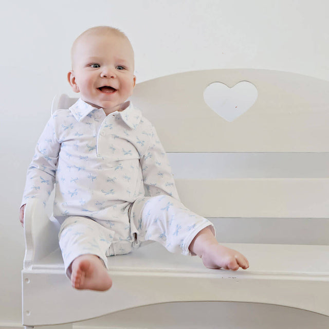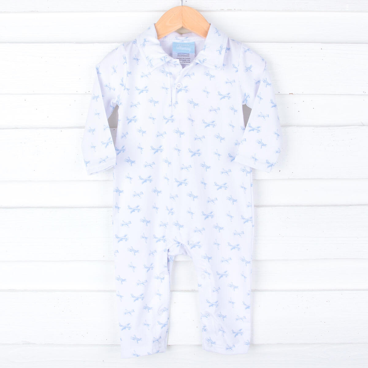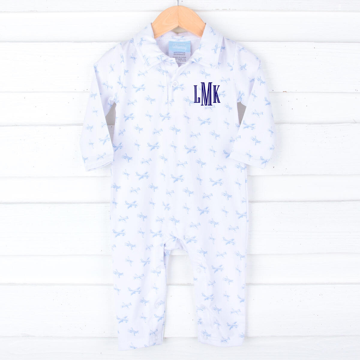 This Airplane Print Polo Romper is a sweet choice for any occasion! Whether it’s a day at school, playtime with friends, or a family outing, this outfit is ready for anything. The darling airplane print knit romper features long sleeves and a sweet collar for a touch of whimsy. Snaps at the stride make changes easier. Make it even more special by adding a monogram to personalize this delightful romper.