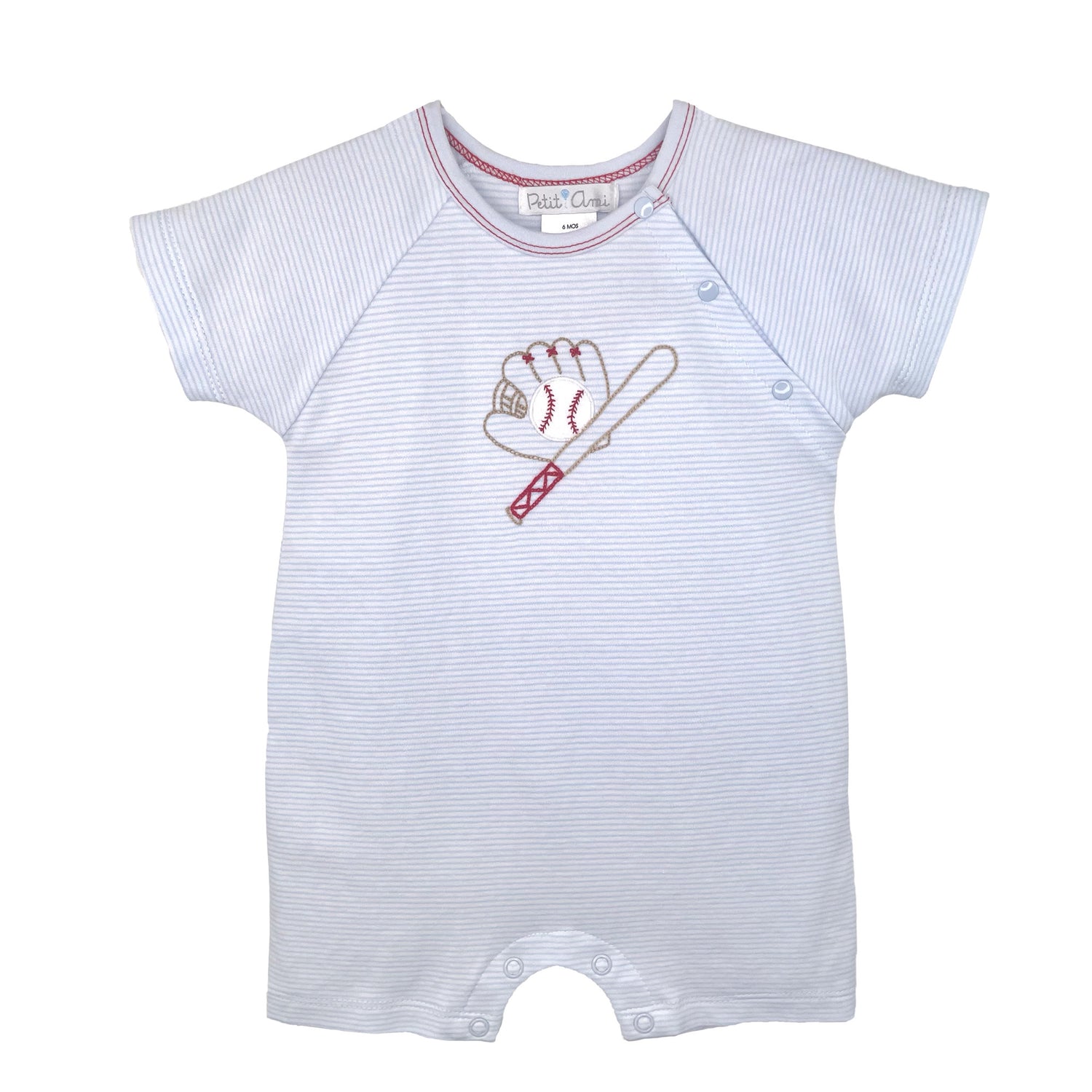 It's baseball season! Get your little one ready to cheer with the Baseball Embroidered Blue Stripe Knit Romper. The blue stripe romper is adorned with a cute embroidered baseball, bat, and glove. With shoulder buttons and snaps in stride. This adorable outfit is just what he needs to show off his sporty spirit!