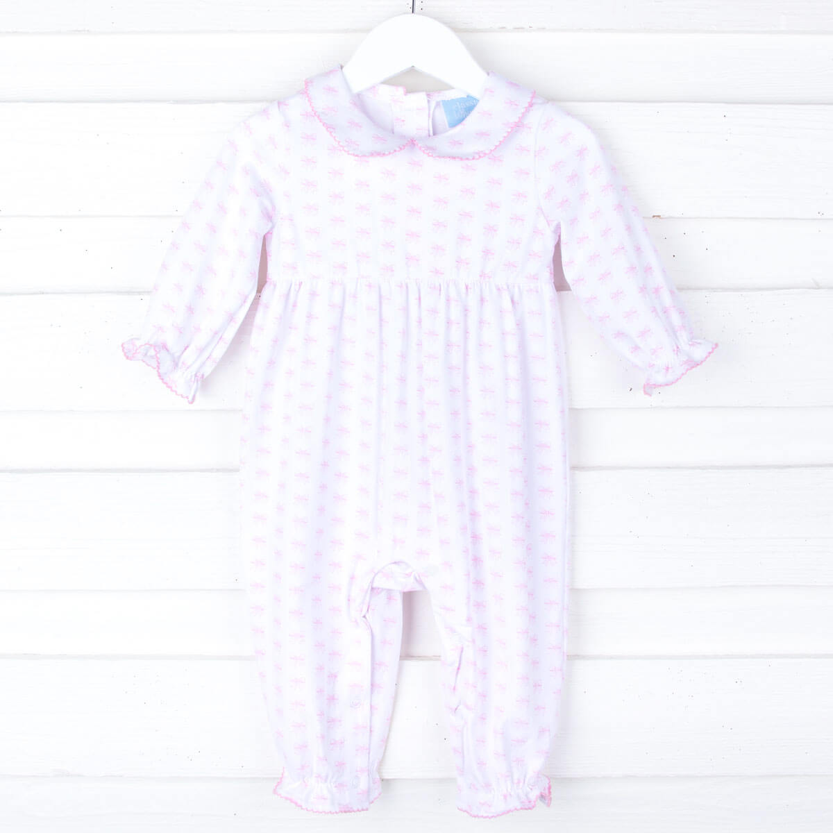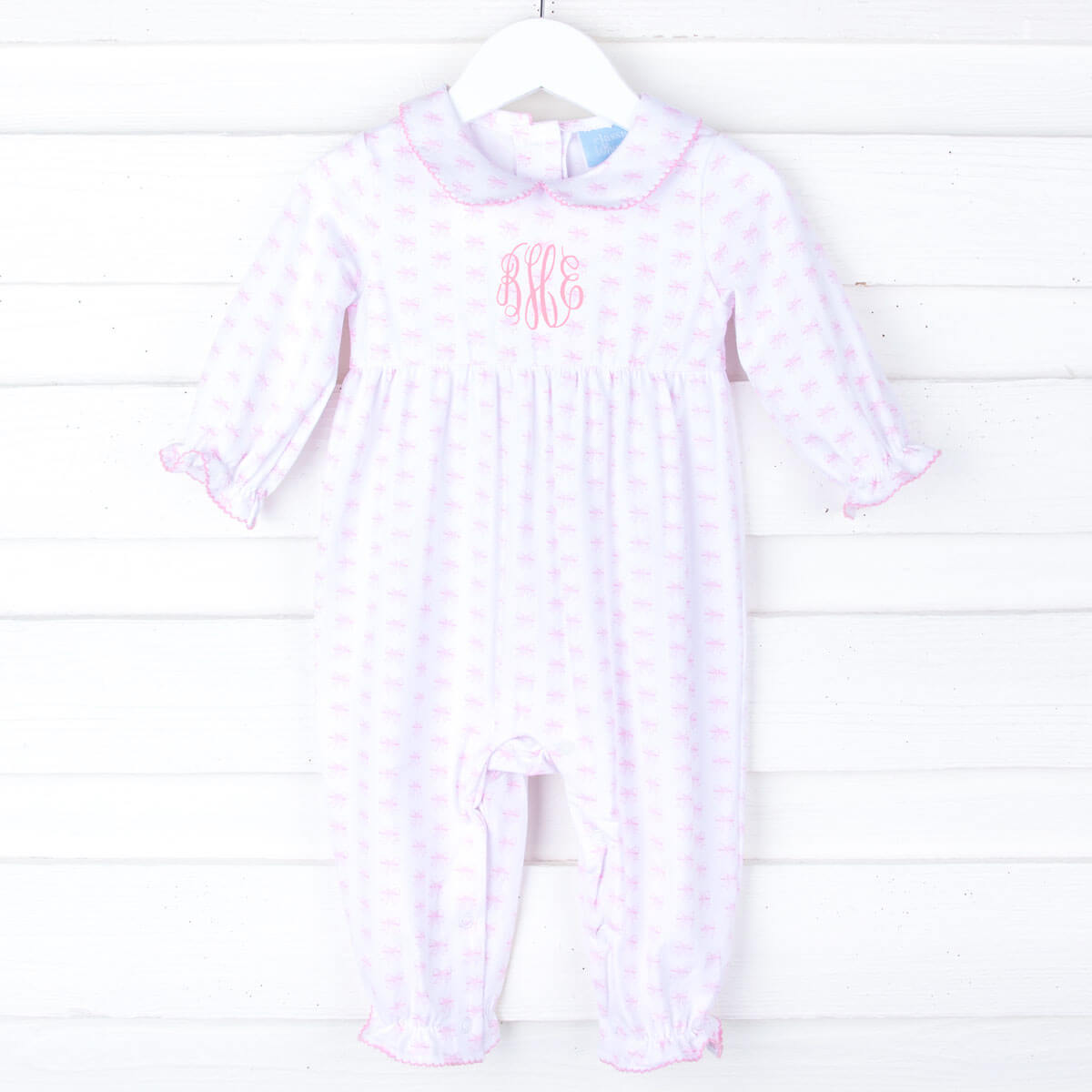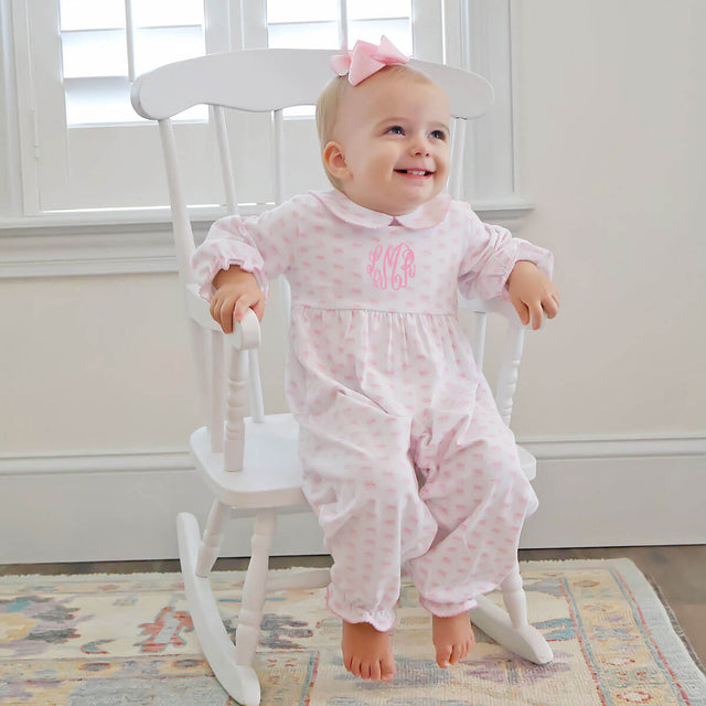 This Bow Print Ruffle Romper is a sweet choice for any occasion! Whether it’s a day at school, playtime with friends, or a family outing, this outfit is ready for anything. The darling pink bow print knit romper features long bishop sleeves and a sweet collar for a touch of whimsy. Snaps at the stride make changes easier. Make it even more special by adding a monogram to personalize this delightful outfit.