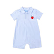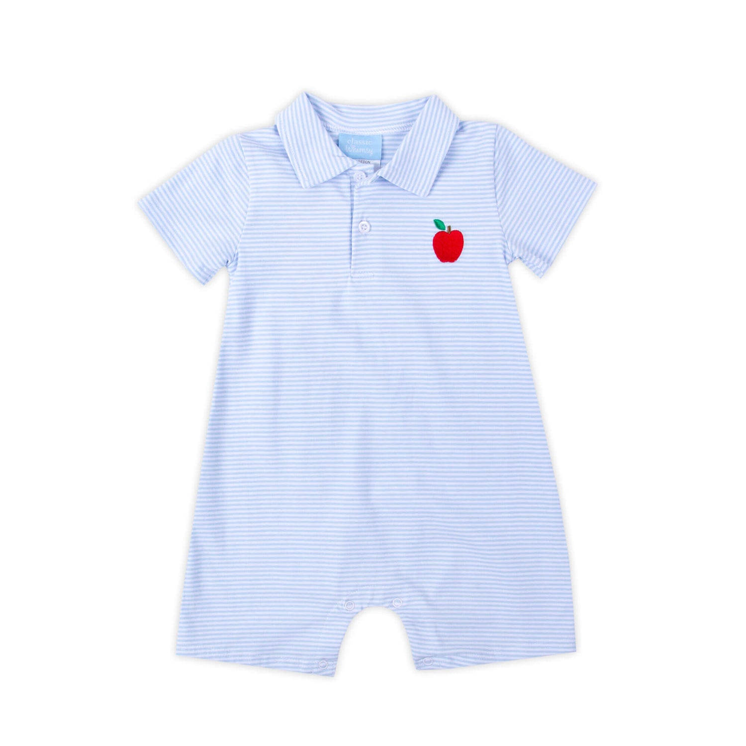 Your little one will be ready for school in the Darling Apple Light Blue Stripe Polo Romper! This light blue striped soft knit romper features a side pocket with an embroidered apple and snaps in stride for easy changes. Ideal for both learning and play! Add a monogram for a personalized touch!