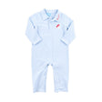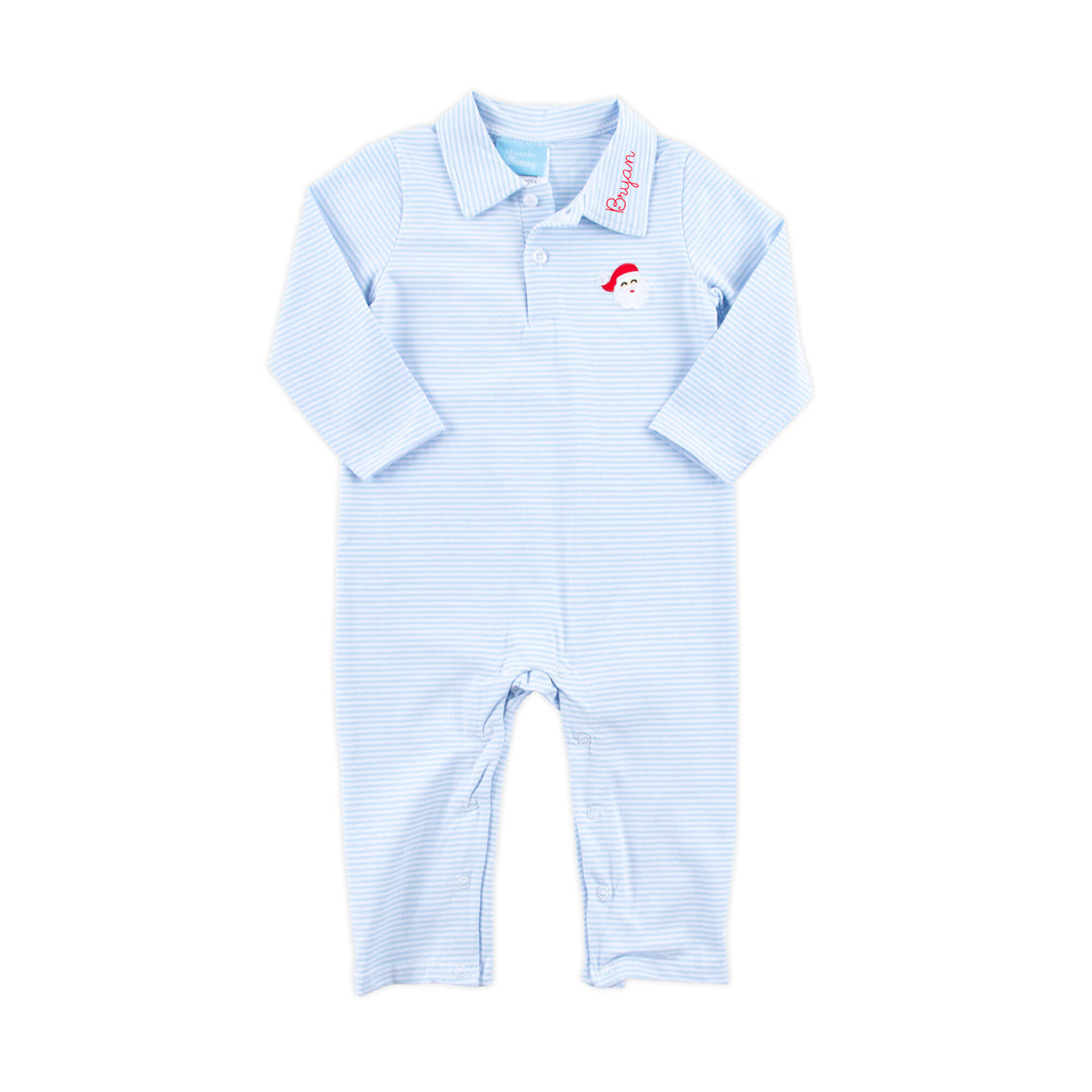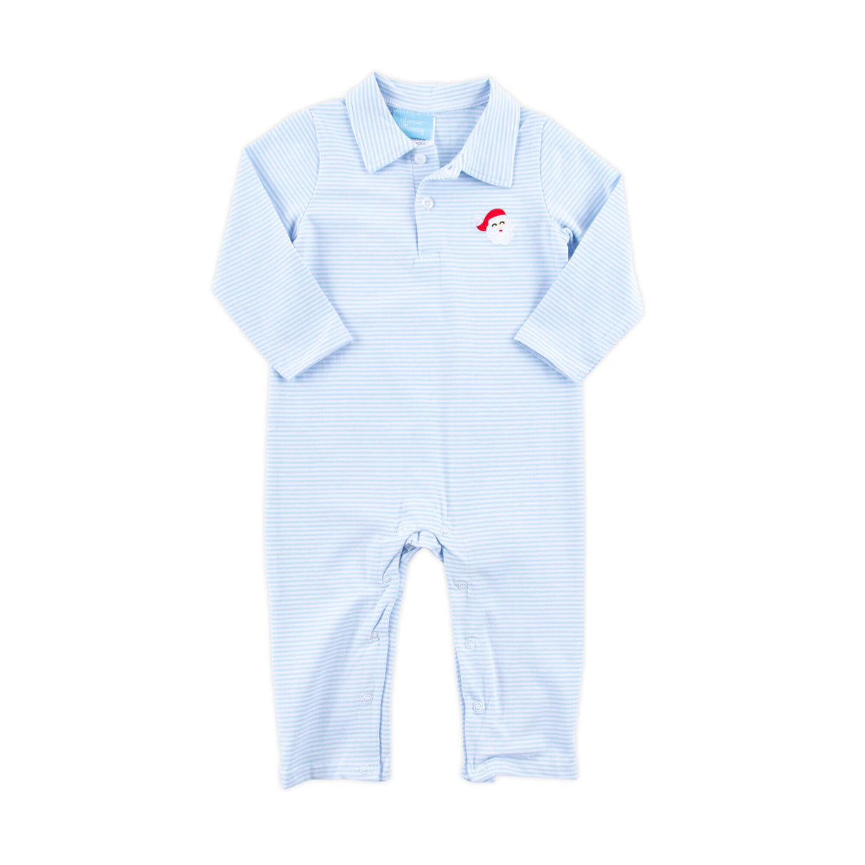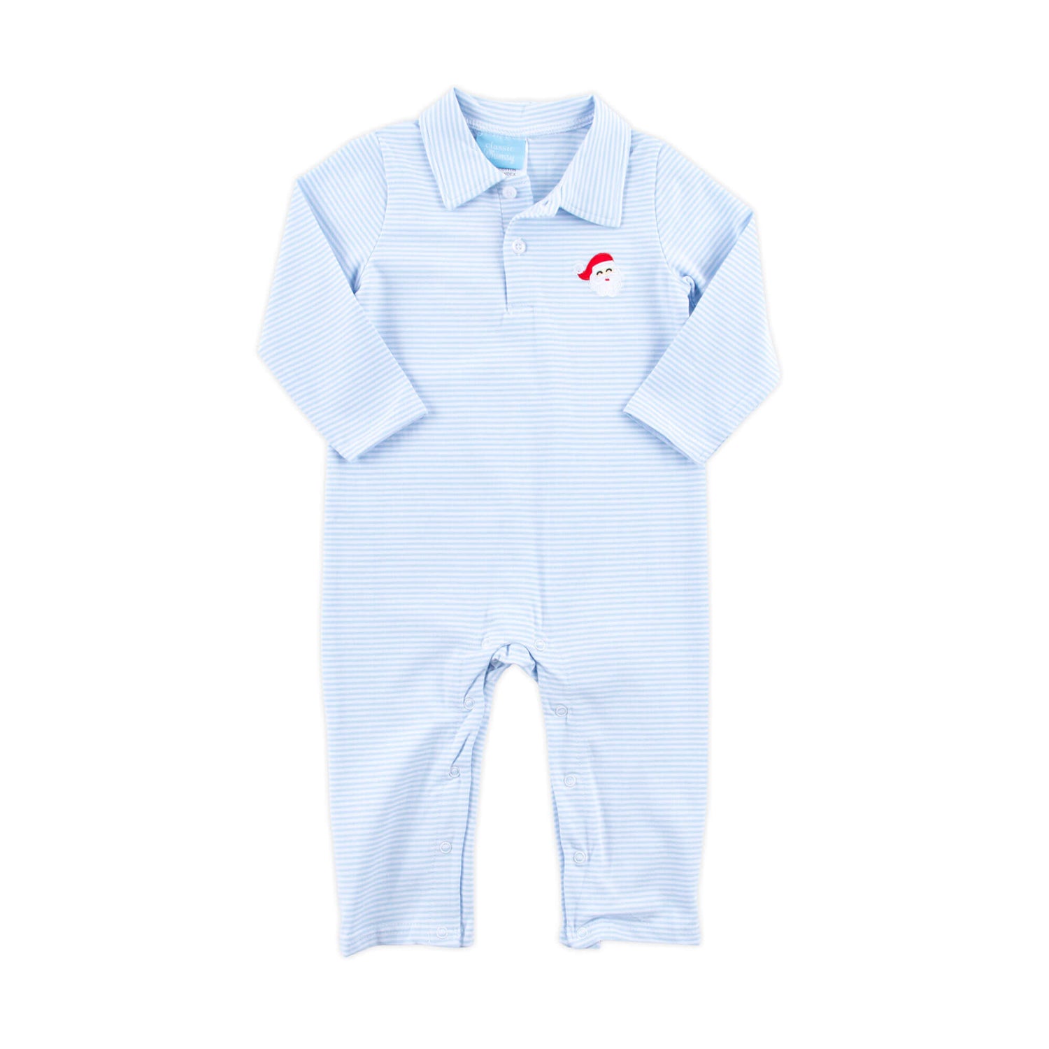 Celebrate the holiday season in our Happy Santa Light Blue Stripe Polo Romper! This light blue striped polo romper features a cheerful Santa appliqué on the side and long sleeves for an extra charming touch. Snaps in the stride make for easy changes, perfect for festive fun and cozy days!
