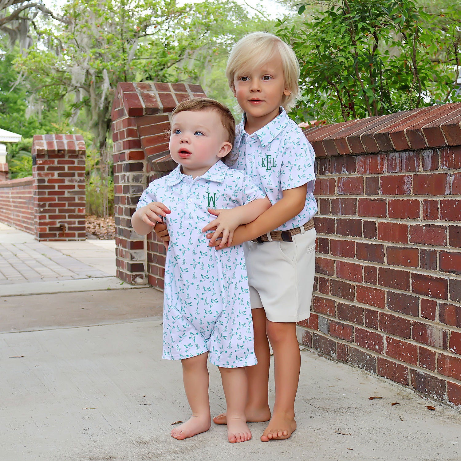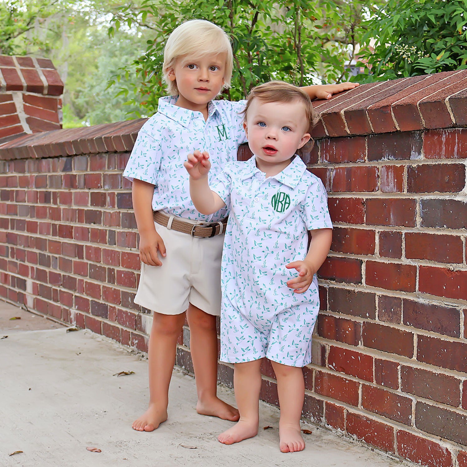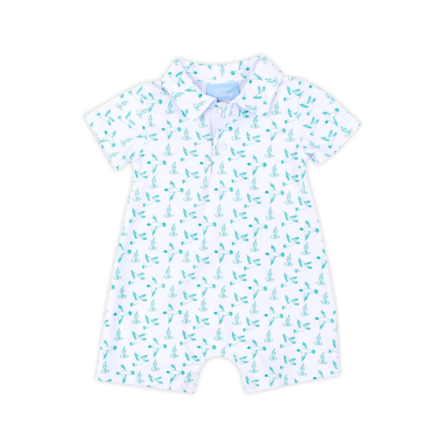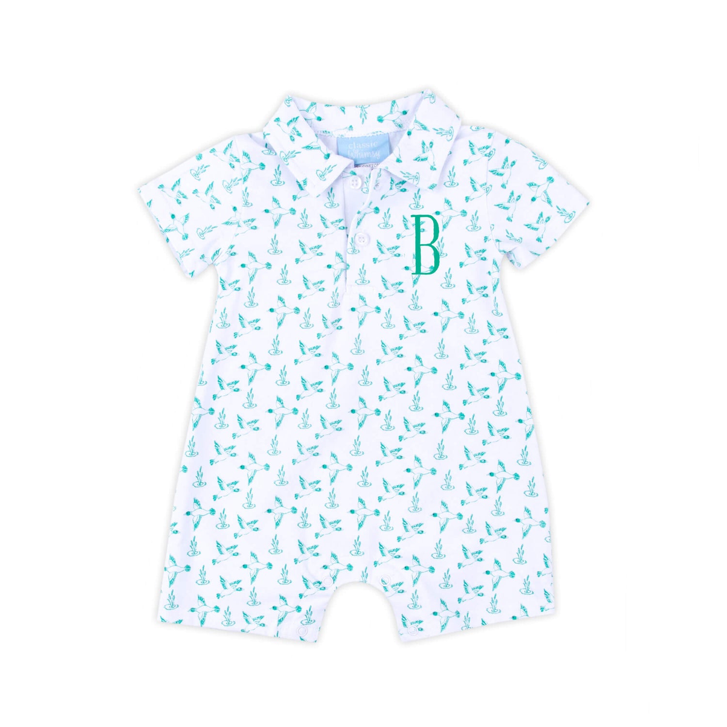 Quack! Quack! Your little duckling will love this Mallard Pond Polo Romper. Features a mallard duck print with snaps in the stride to make dressing up a breeze. Add a monogram for a personalized touch that makes it even more special!