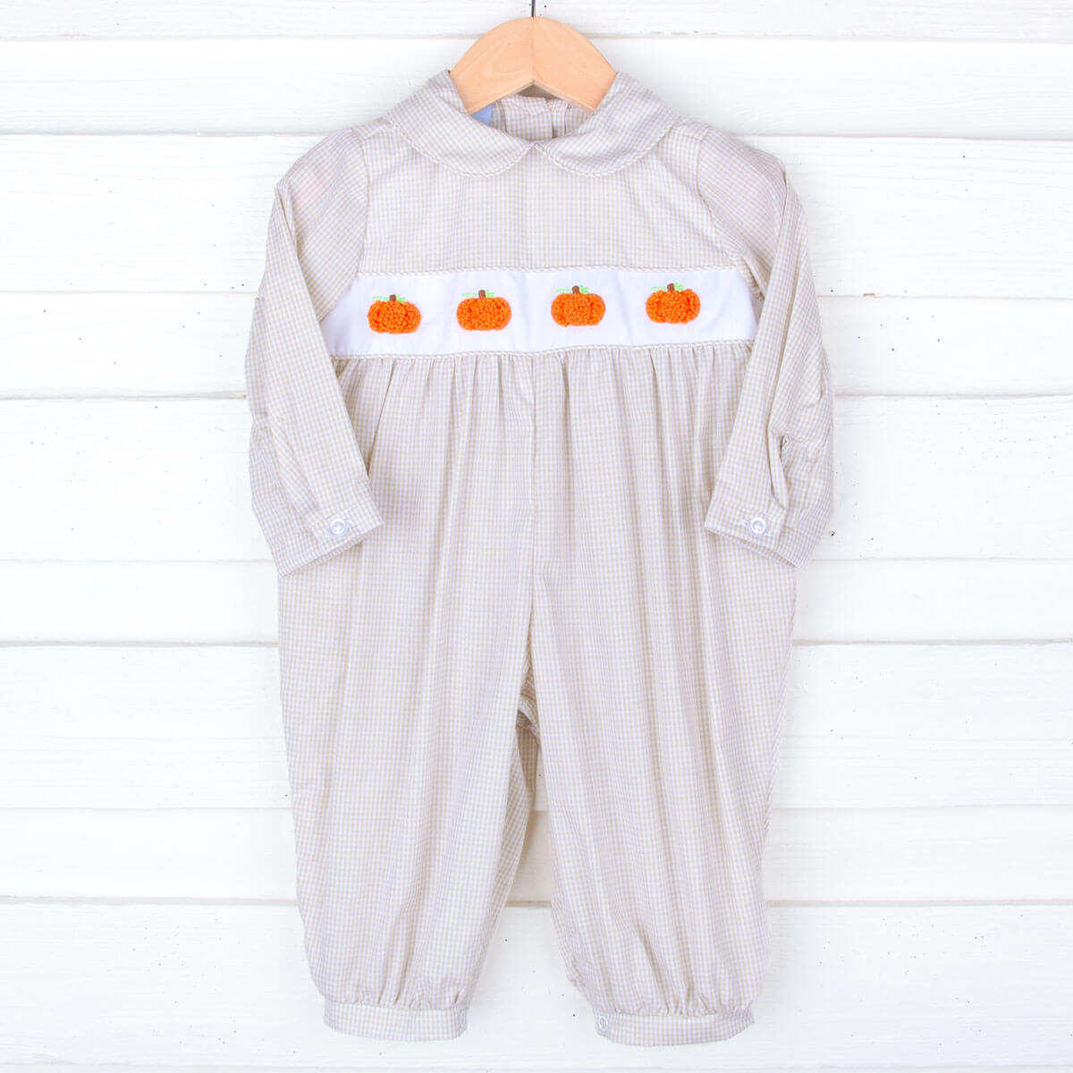 This Pumpkin French Knot Tan Gingham Romper is made for picture-perfect pumpkin patch photos! This charming romper features adorable French knotted pumpkins, ready for all your fall adventures. Snaps in stride make for easy changes.