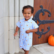 It's pumpkin season, and your little one will look adorable in our Pumpkin Schiffli Light Blue Gingham Polo Romper! The light blue gingham romper features sweet custom embroidered pumpkins with snaps in the stride to make dressing up a breeze.