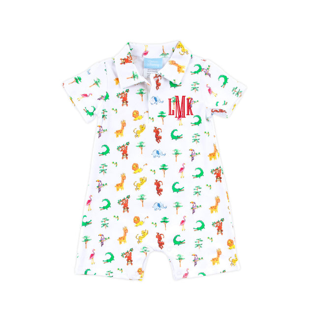 Get ready for a field trip to the zoo with our Safari Polo Romper! This polo romper features a cute safari animal print, short sleeves, and snaps in the stride for easy changing, making it the perfect outfit for outings, playtime fun, comfort, and cuteness. Add a monogram to make this outfit even more special!