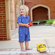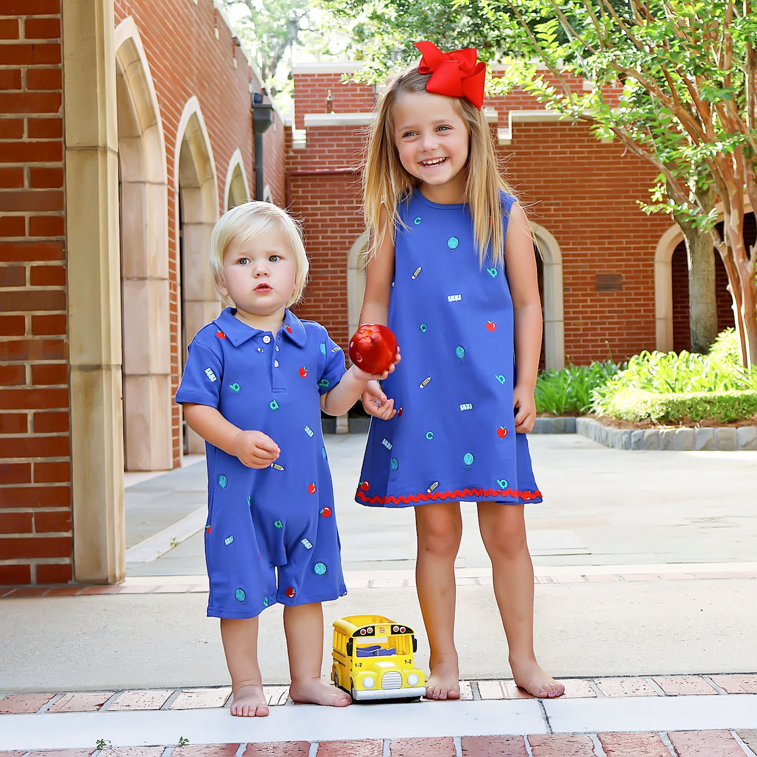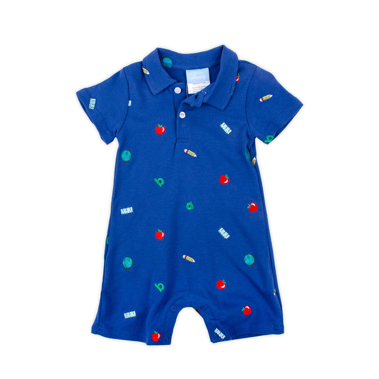 Your little one will be all set for a fun-filled school year in the School Rules Blue Polo Romper! This playful short sleeve soft knit polo romper features with back-to-school embroidered charm and is sure to be a favorite. Snaps in stride for easy changes.