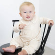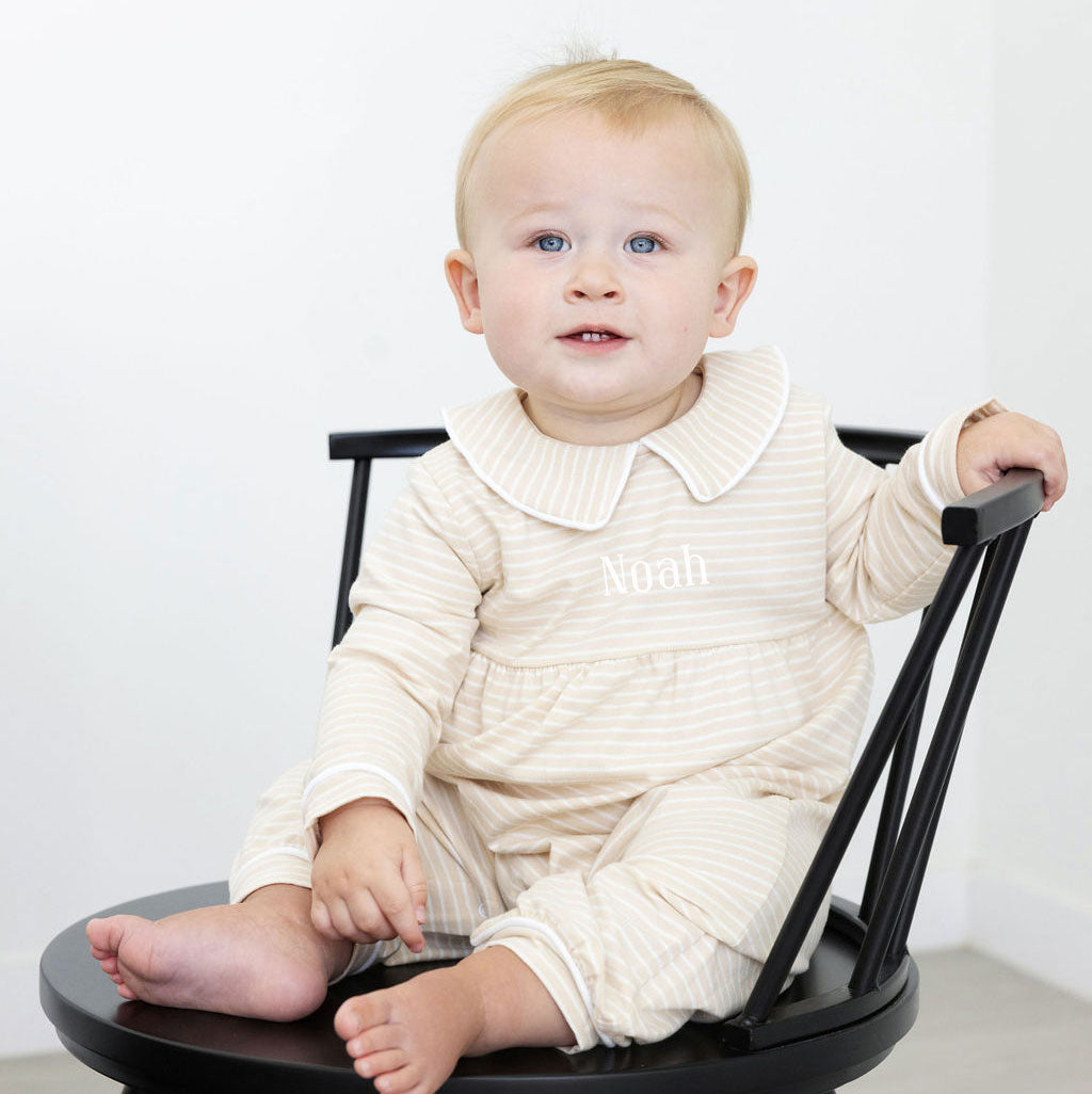 The Tan Stripe Romper is a delightful choice for playtime during cooler weather! Designed with comfort in mind, this long sleeve knit romper is not only perfect for school and playtime but also transitions seamlessly for various occasions. It features a stylish collar with picot trim and convenient snaps in stride. Whether it's a casual outing or a day at school, this romper ensures both style and comfort. Elevate its charm by adding a monogram, making it uniquely adorable.