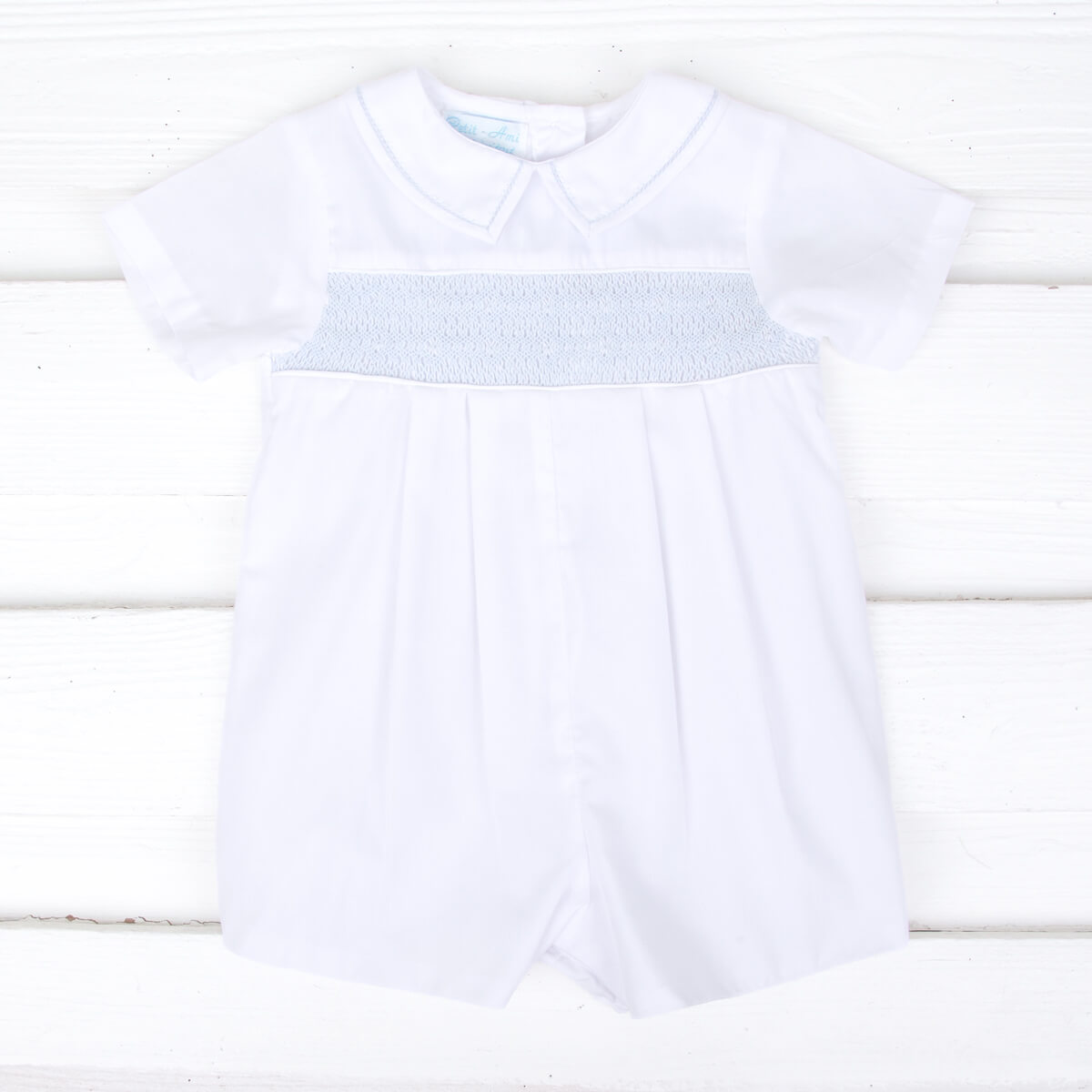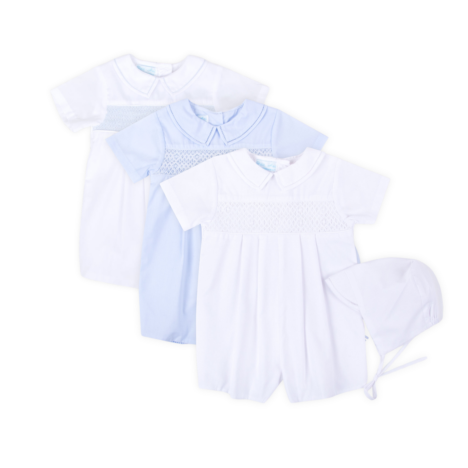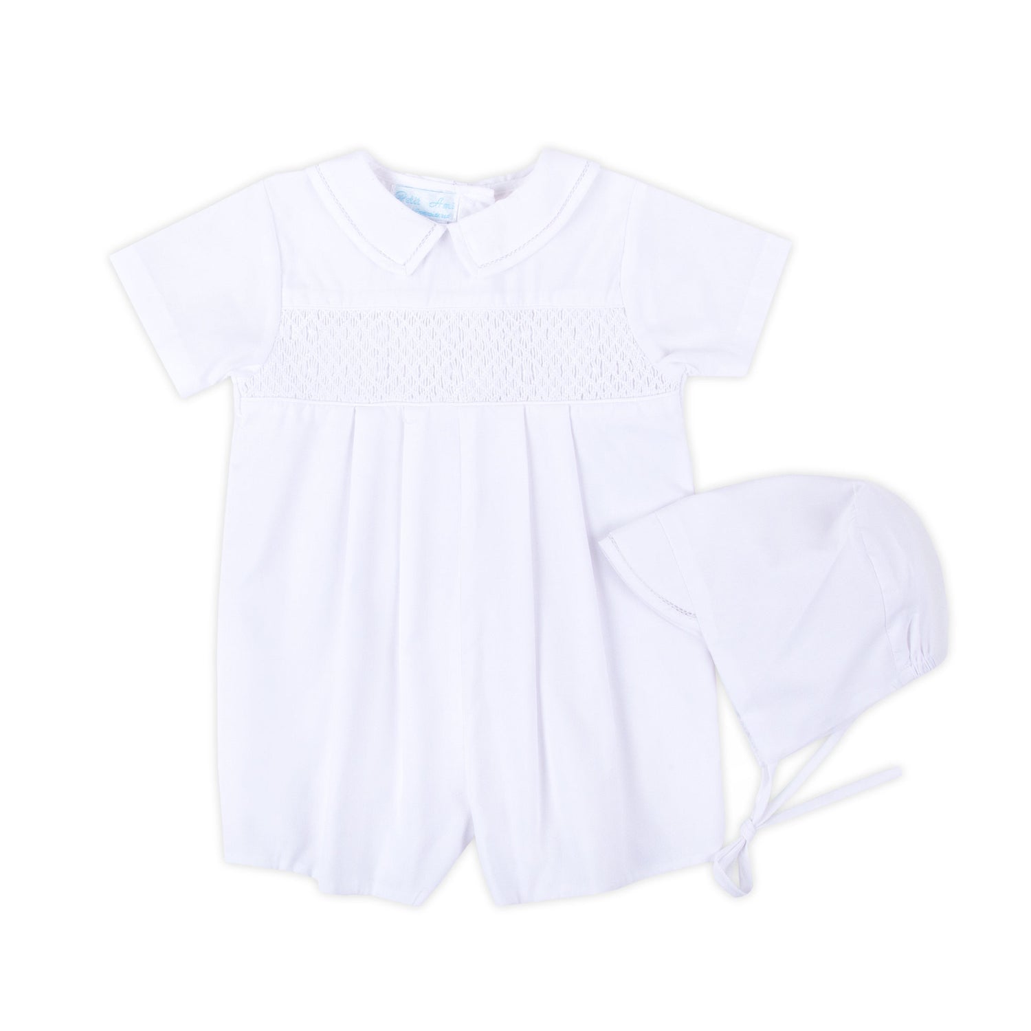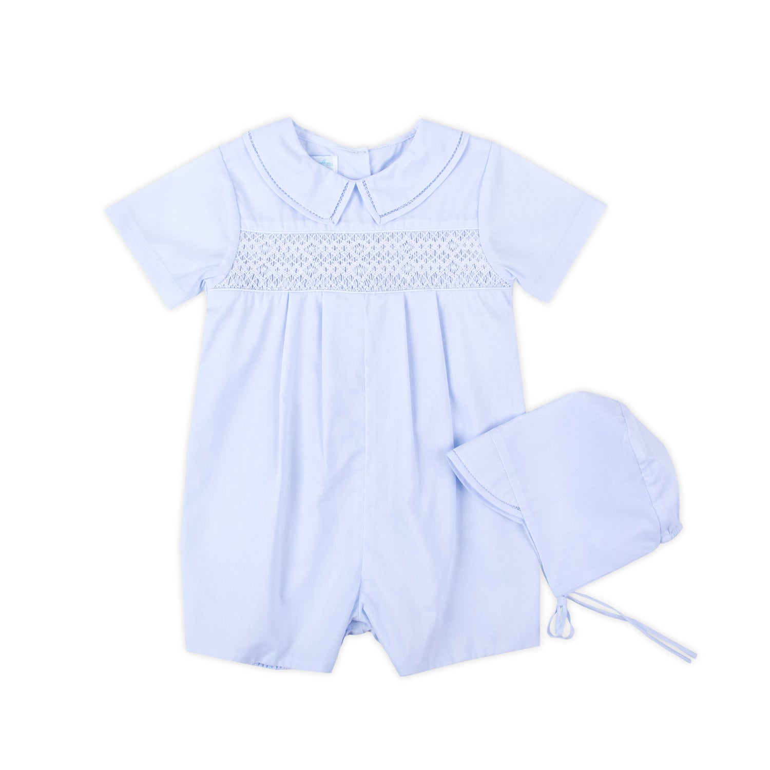 This Classic Smocked Collared Shortall is the perfect outfit for any special occasion! Featuring pleated details, a classic collar, geometric smocking, and convenient snaps in stride, it comes complete with a matching bonnet. Ideal for special events like church, christenings, or holidays.