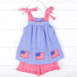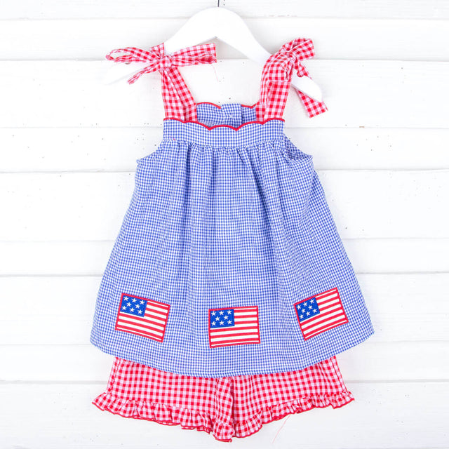 This American Flag Blue Gingham Aurora Short Set is perfect for celebrating the 4th of July and enjoying fireworks. The Aurora-style top in blue gingham features American flag appliqués and red gingham tie straps. The set is completed with red gingham shorts for a patriotic look.