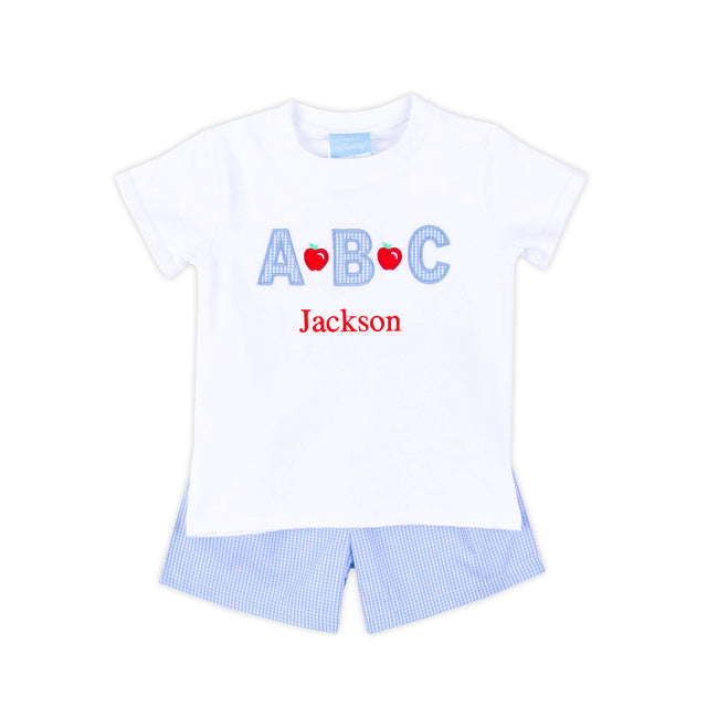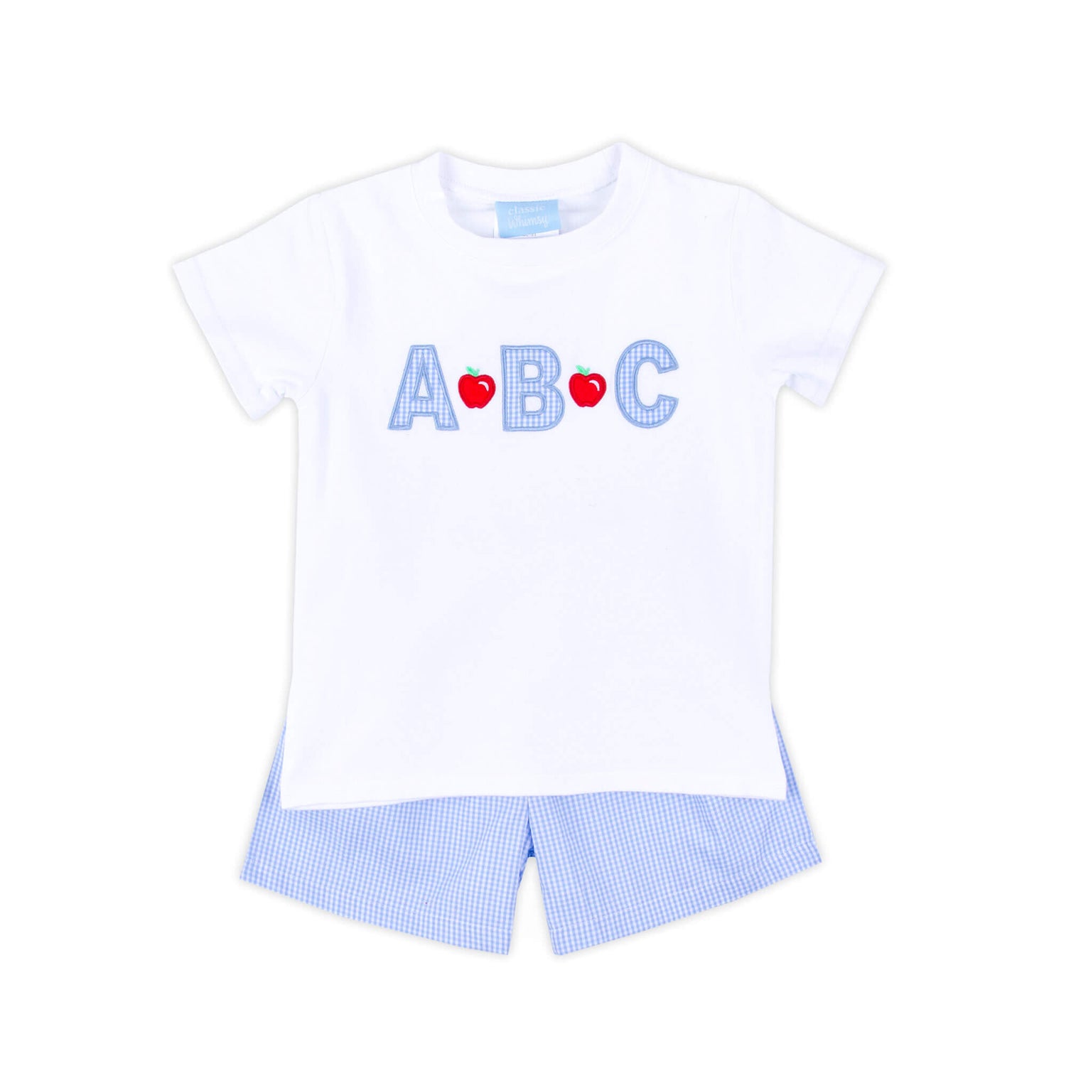 This sweet Apple & ABC Light Blue Gingham Short Set is the perfect outfit for school days! The charming white soft knit shirt features a fun ABC applique and is paired with light blue gingham shorts. It’s a playful and stylish choice for your little one’s back-to-school adventures! Add a monogram for a personalized touch!