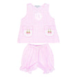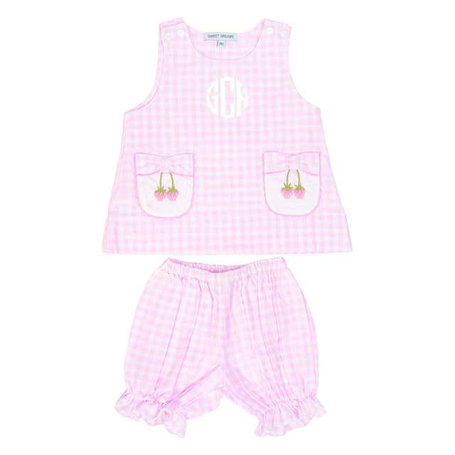 This Bow Pocket Embroidered Strawberry Bloomer Set is the sweetest spring outfit. The sleeveless top features pink gingham with custom embroidered berries on bow pockets. The set is completed with matching pink gingham bloomers for a delightful and coordinated look. Add a monogram to make it extra special!