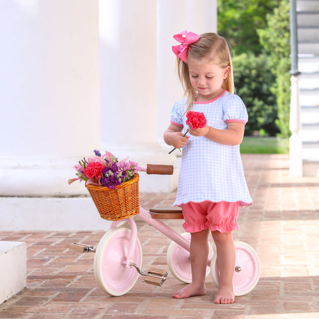 Your little one will be ready to soak up all the spring and summer fun in our darling Cecilia Light Blue Knit Gingham Bloomer Set! The light blue knit gingham top features sweet pink tape trim and an adorable scalloped hem, perfectly paired with coordinating pink bloomers. Make it extra special by adding a monogram for a standout look this season!