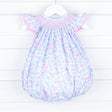 This Geometric Smocked Garden Rose Bubble is a classic outfit for Spring Portraits! Features geometric smocking and flutter sleeves. Snaps in stride.