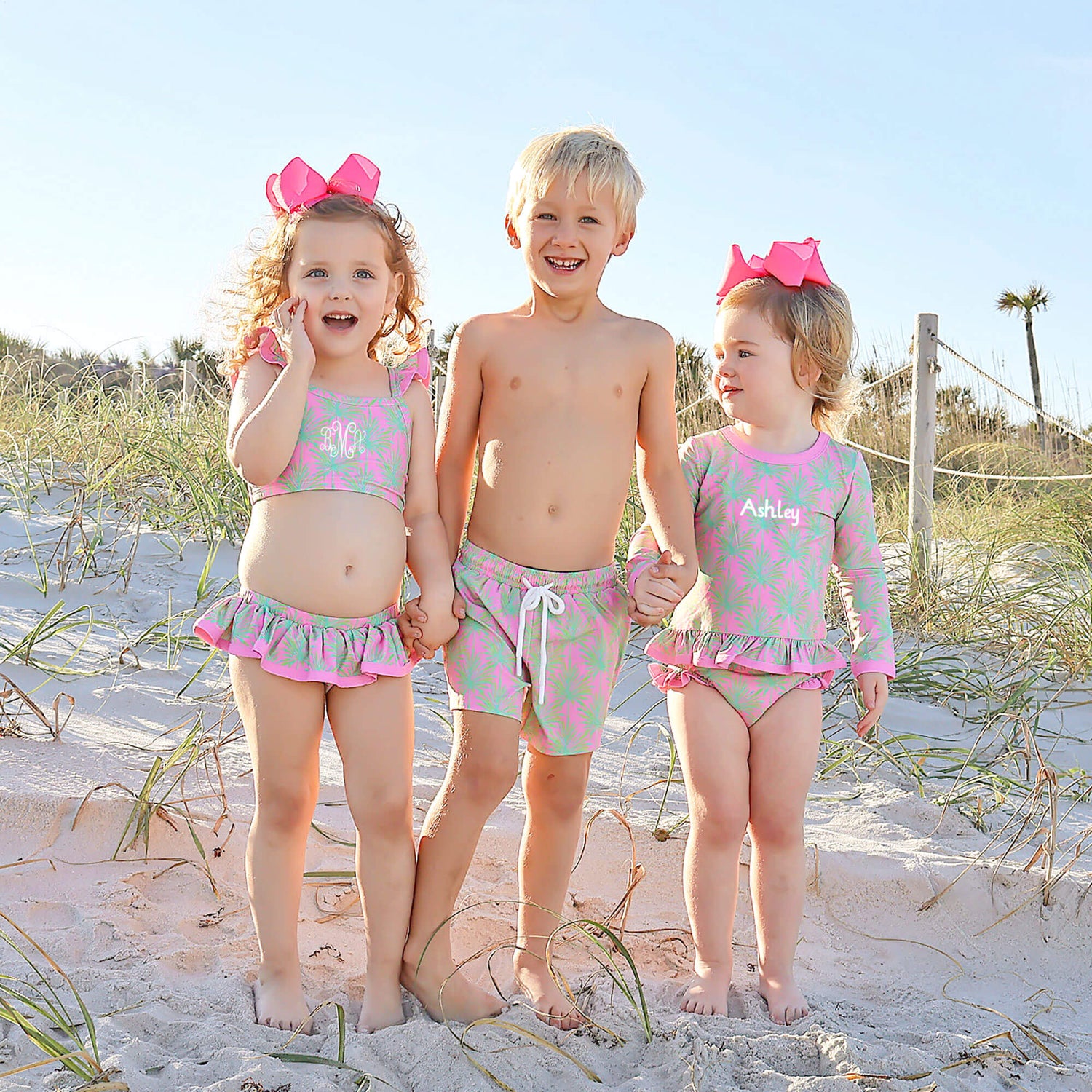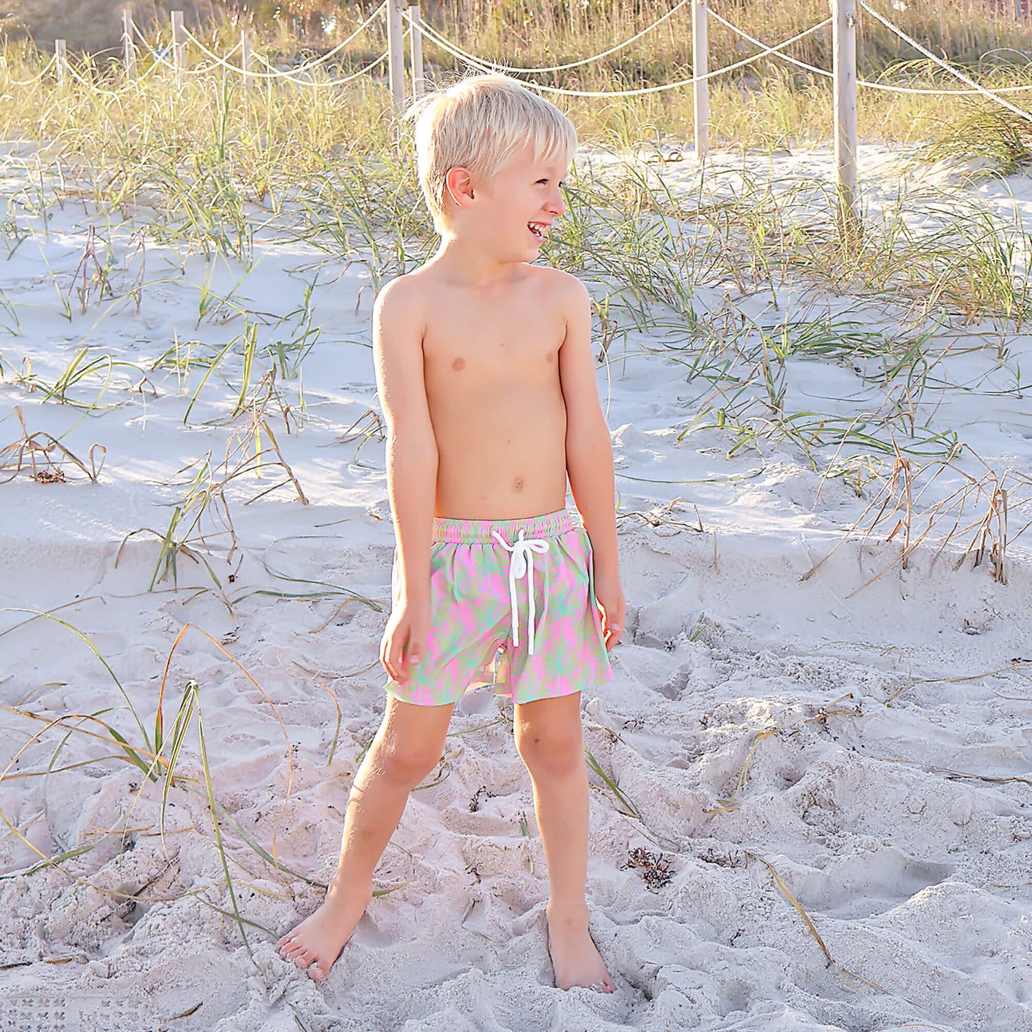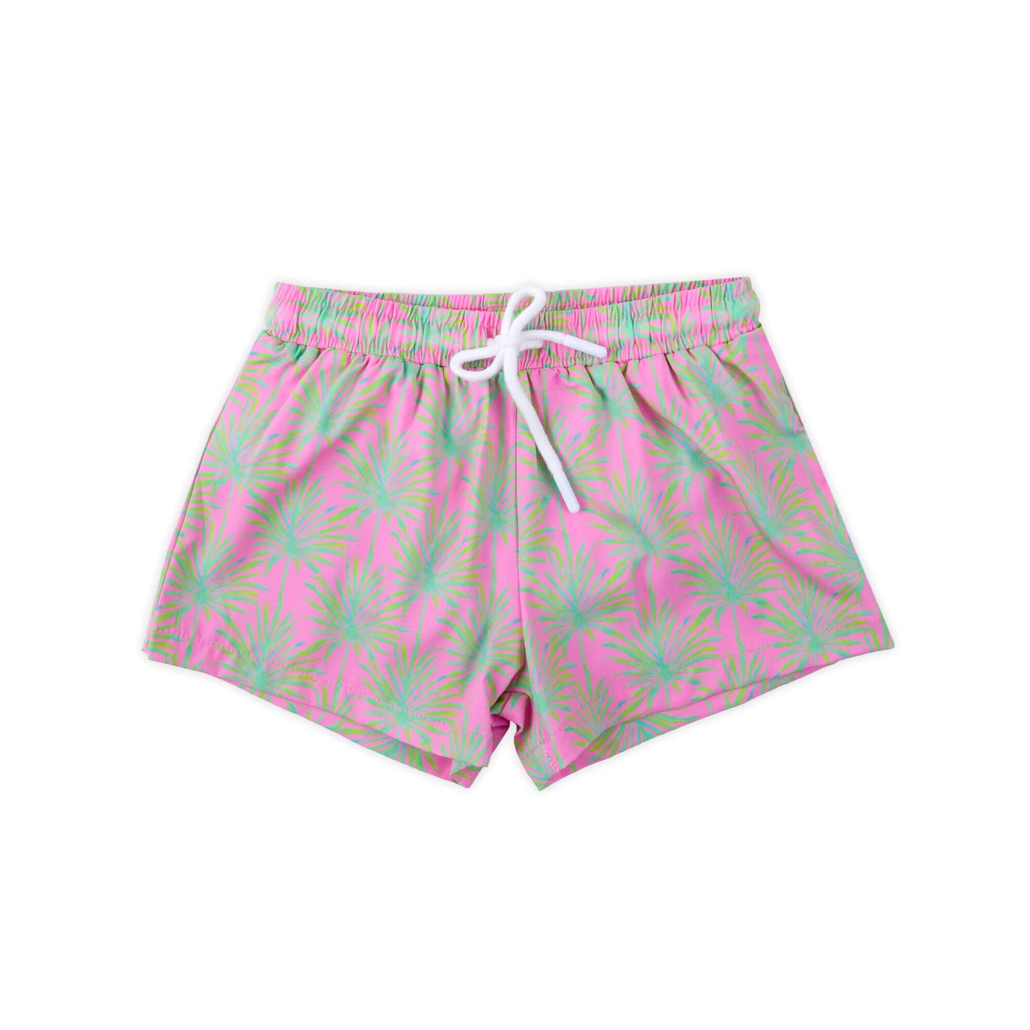 The Paradise Palm Pink Swim Trunks are an excellent option for your upcoming family vacation or poolside gathering. These boy's swim trunks feature a charming paradise palm print with a self fabric packet at the back and an easy pull-on waist. They provide UPF 50 Sun Protection to keep your little one safe under the sun. Personalize it with a monogram for a special touch that makes this swimsuit uniquely theirs. Perfect for making sunny memories!