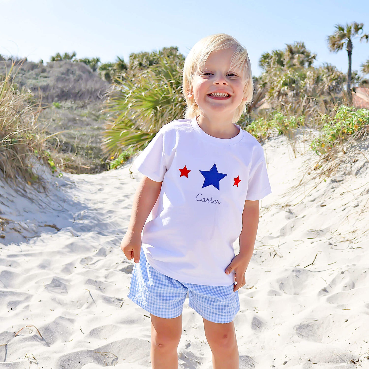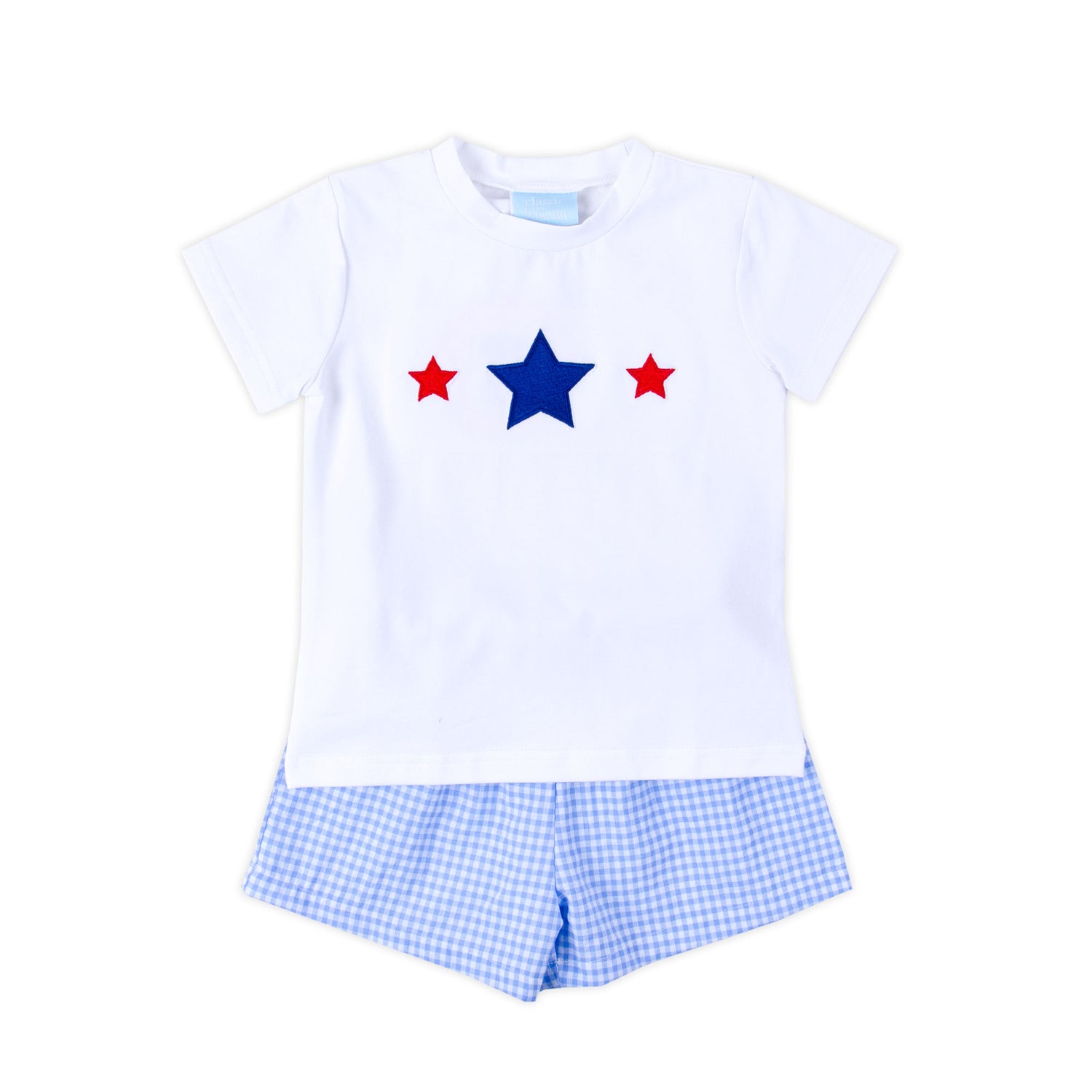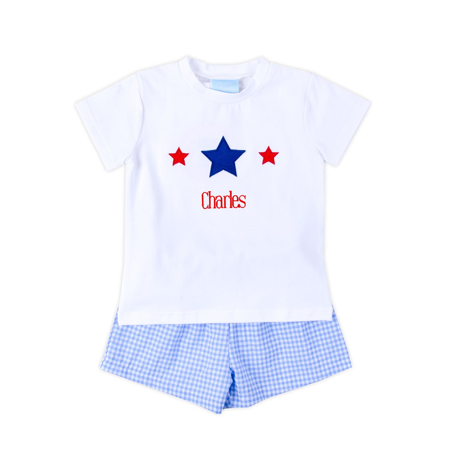 This Star Spangled Light Blue Gingham short set is perfect for celebrating the 4th of July and enjoying fireworks. The white knit shirt features adorable embroidered patriotic stars, paired with light blue gingham shorts.