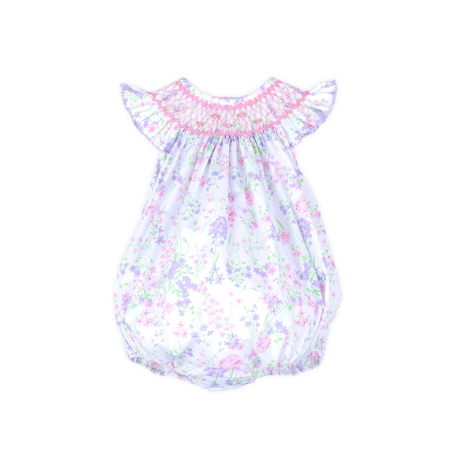Embrace sunny days with the Monet's Garden Smocked Angel Sleeve Bubble, the perfect choice for any occasion. This bubble features a delightful pink and purple floral print, coupled with charming geometric smocking and angel sleeves adorned with purple trim picot. Complete with snaps in stride, it's both charming and practical for your little one. It's the ideal outfit to brighten up your little one's style for any sunny occasion.