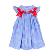 This Summer Blues Smocked Angel Sleeve Dress is the sweetest patriotic outfit. Designed from blue gingham fabric, this dress features geometric smocking and is adorned with red satin bows. It features angel-style sleeves with red picot trim, adding to its charm.