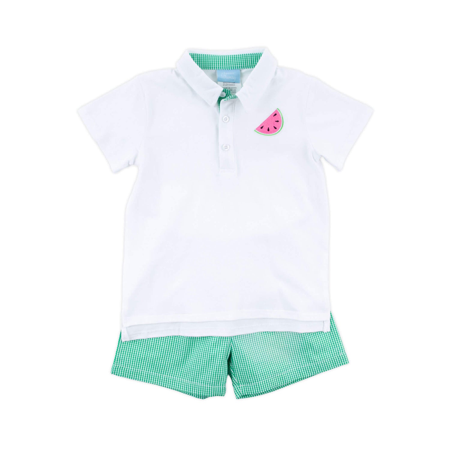 Celebrate summer in style with our Sweet Watermelon Embroidered Green Gingham Polo Short Set. The white knit polo features an embroidered watermelon on the side, while the matching green gingham shorts complete this sunny look. Add a monogram for a personalized touch!
