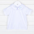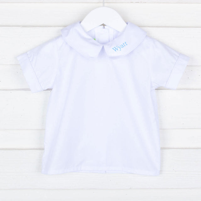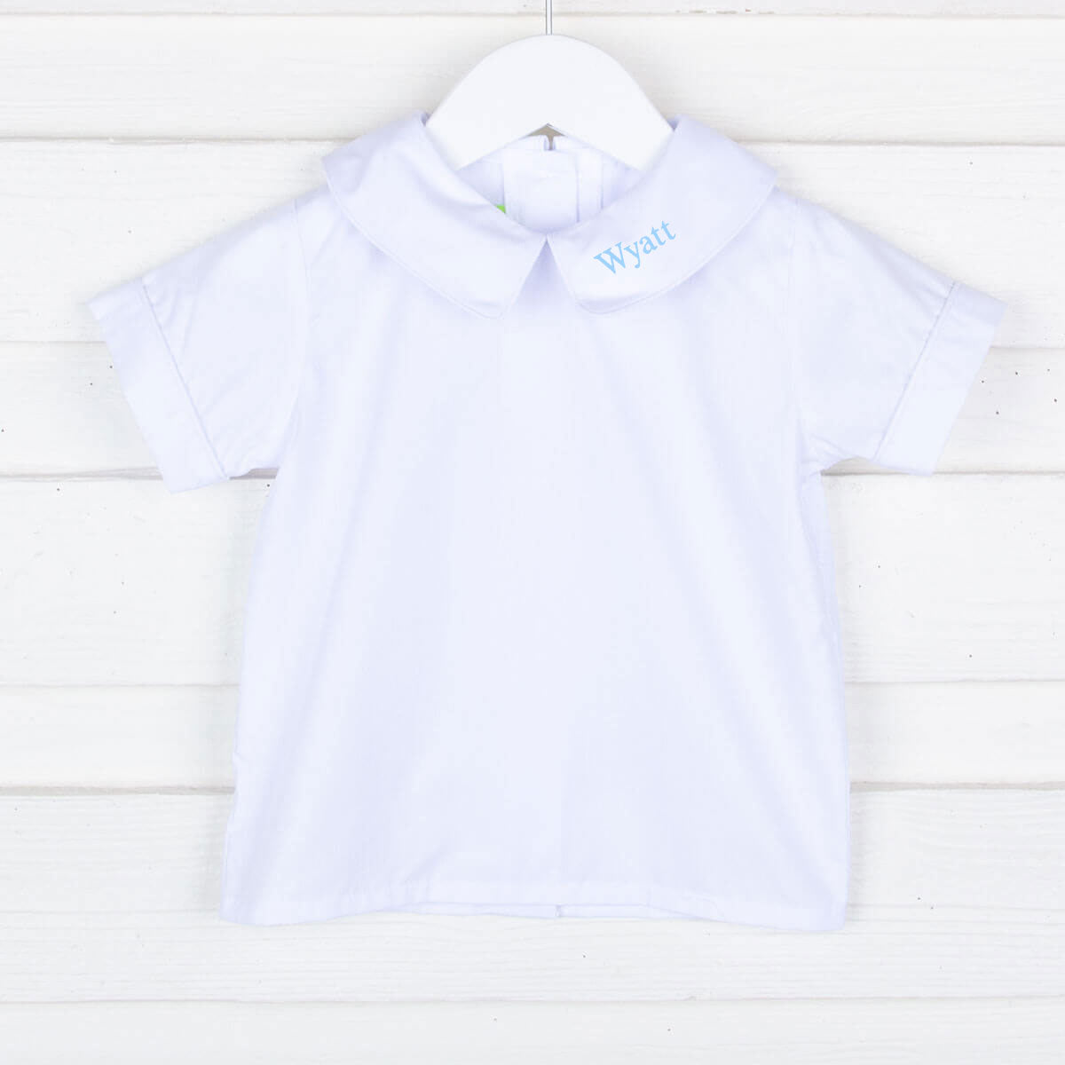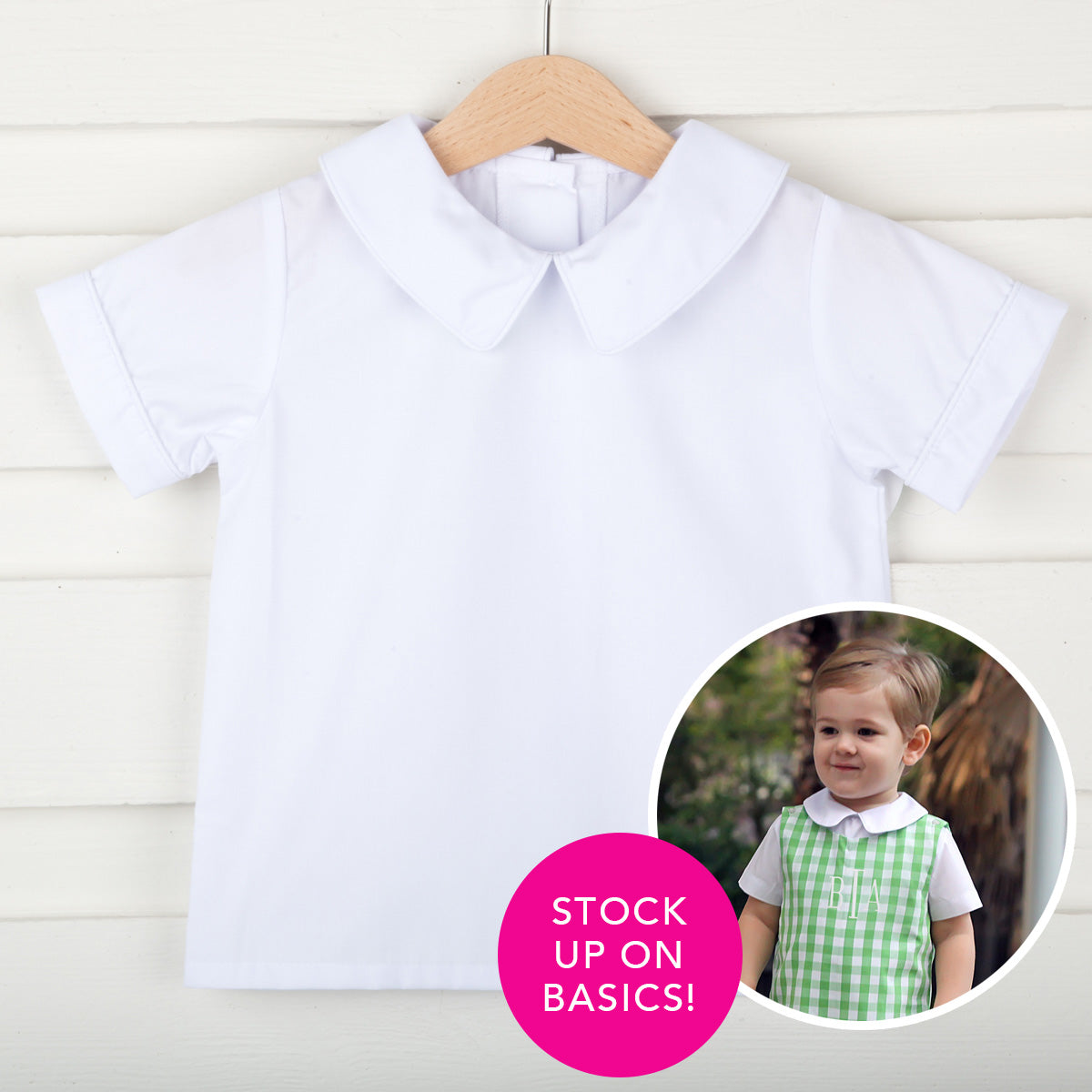 A classic white woven boy's short sleeve undershirt. Peter Pan collar. A boy's wardrobe staple to wear underneath jon jons and longalls or on its own. Buttons in the back. Available in baby, toddler and big boy sizes.
