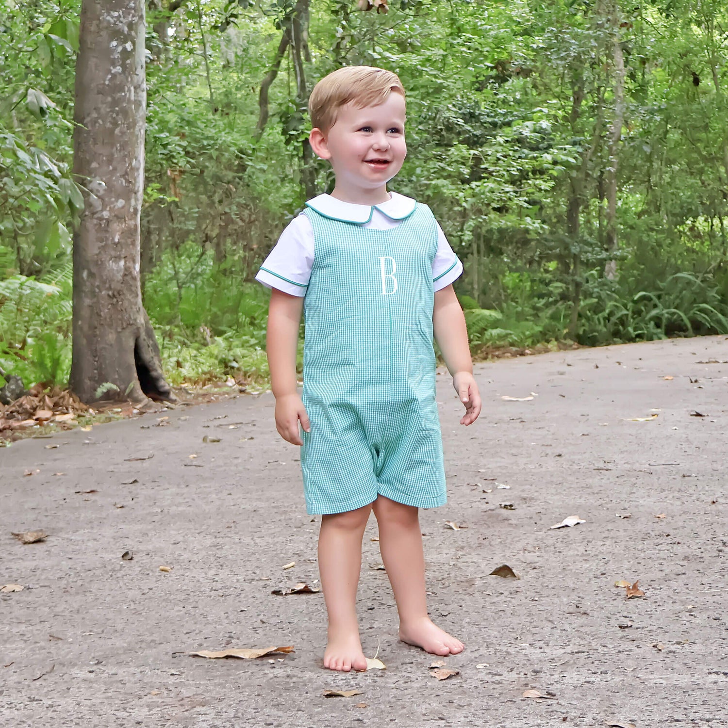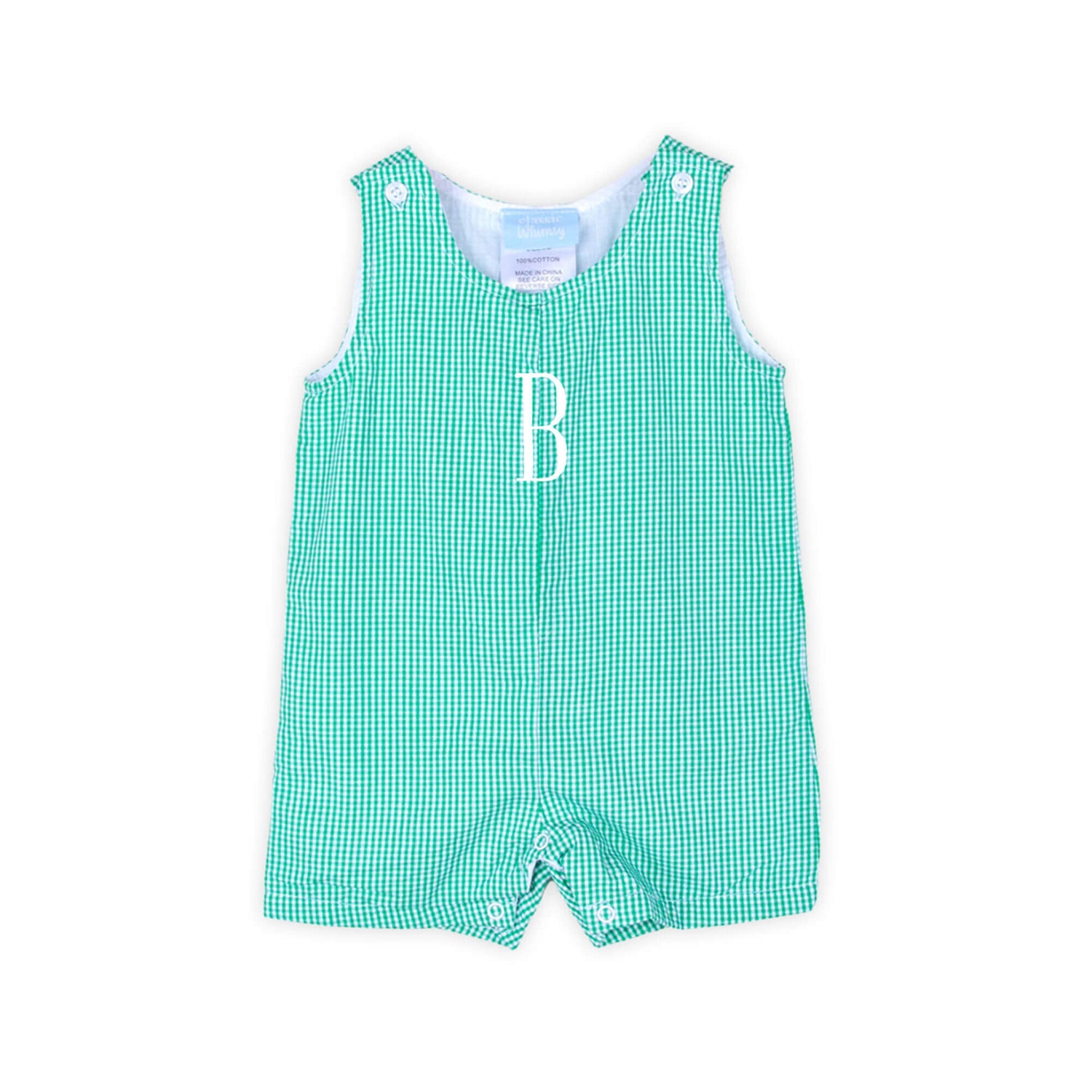 Elevate your little one's wardrobe with our Green Gingham Jon Jon, the perfect addition for the season. This jon jon is both stylish and versatile. It features convenient shoulder buttons and snaps in stride for easy changes. Ideal for outings to the pumpkin patch, Christmas celebrations, St. Patrick's Day or any special occasion, this outfit is sure to make your little one stand out. Personalize it with a monogram to make it even more special and unique!