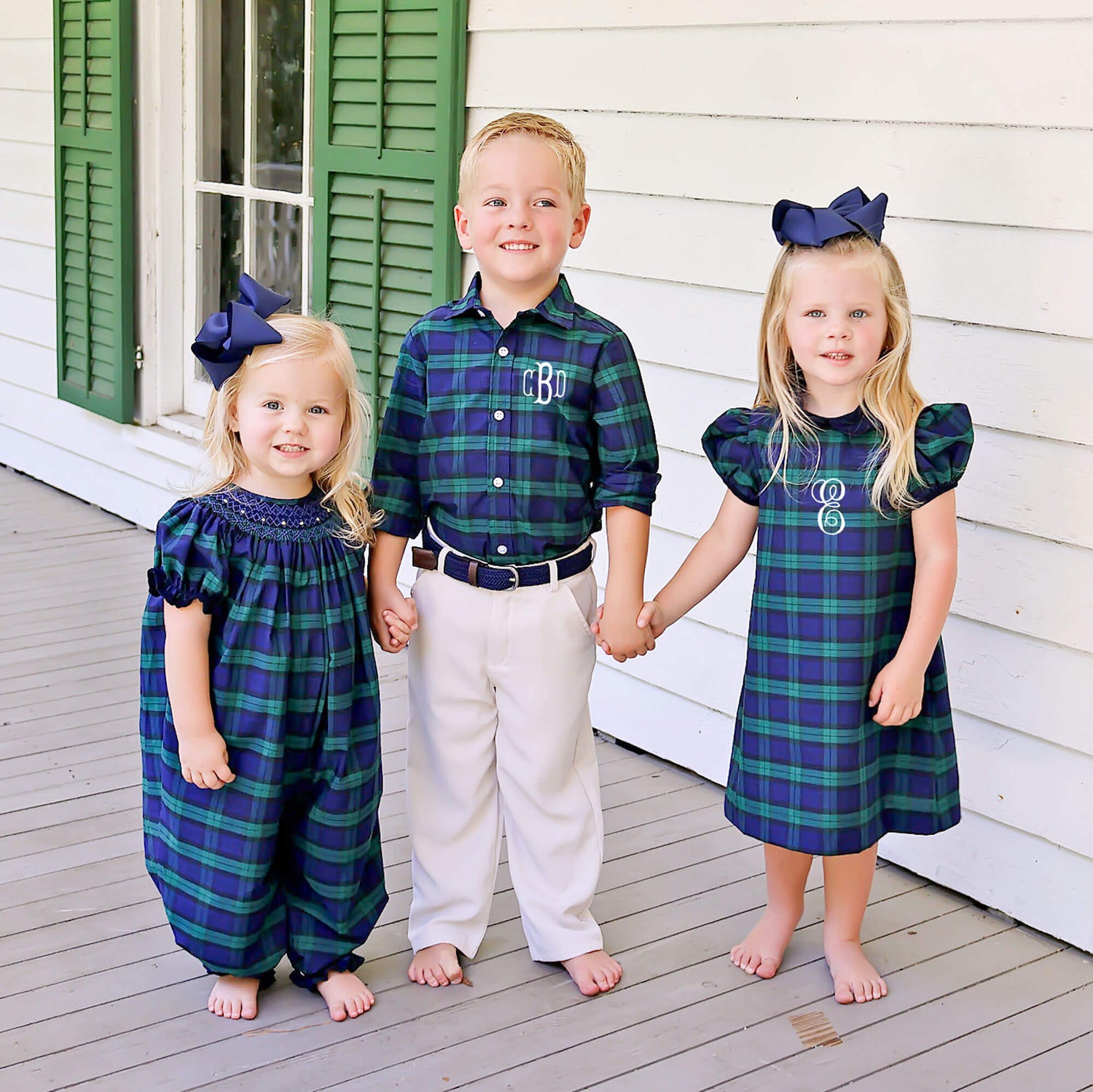 Make sure your little one is picture-perfect for Christmas or Thanksgiving in our Hamilton Plaid Navy & Green Smocked Long Bubble! This classic navy and green plaid bubble features timeless geometric smocking and elegant bishop sleeves, making it perfect for family photos during the holidays. Snaps in the stride ensure easy changes.