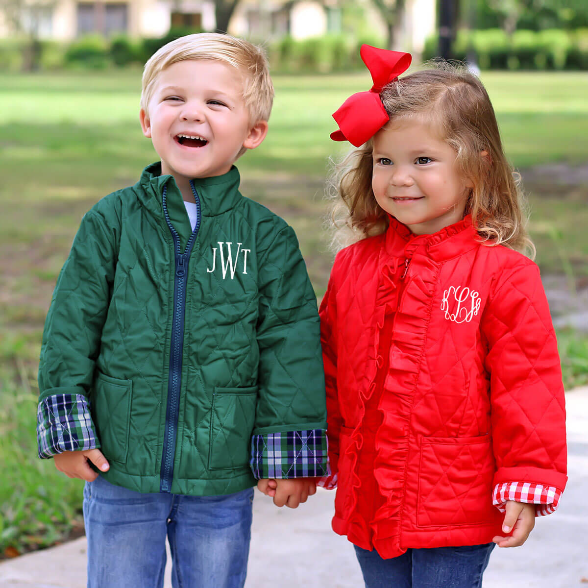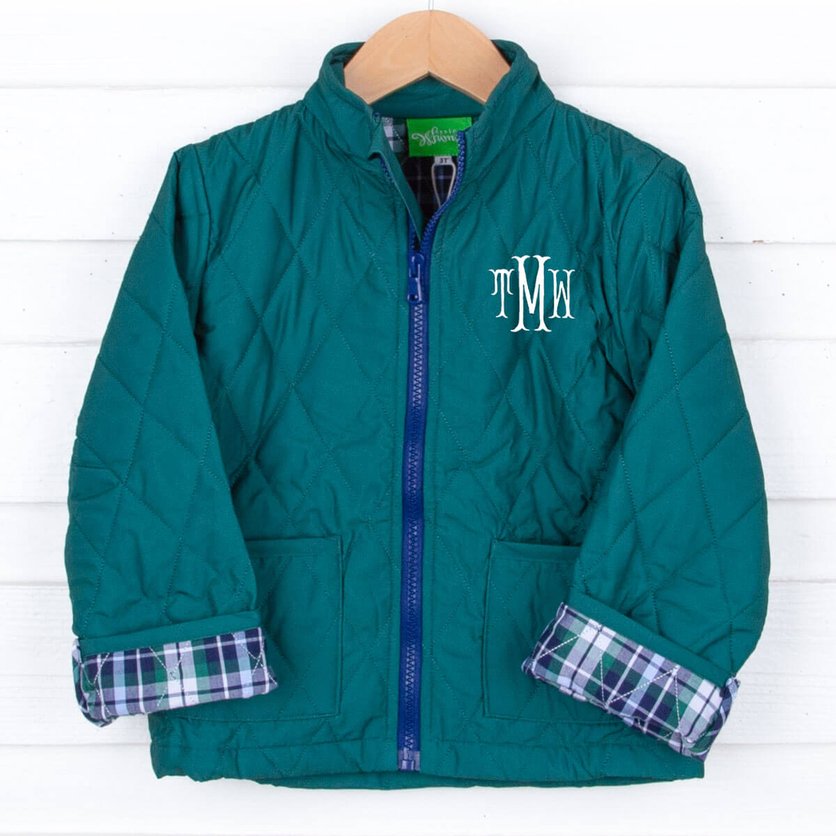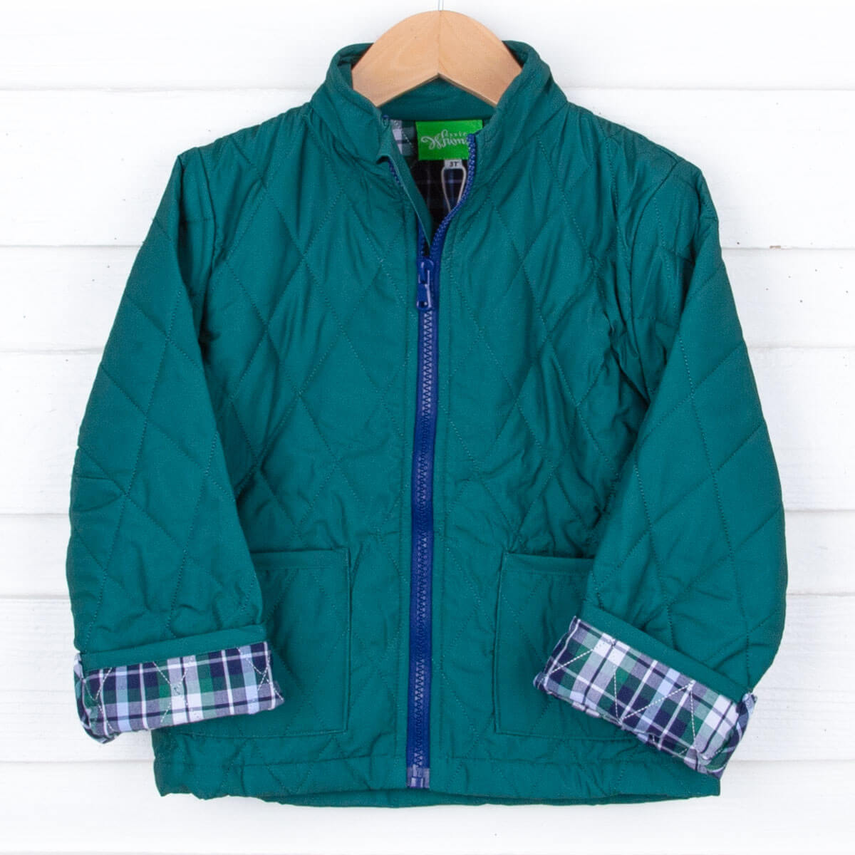 This Hunter Green Quilted Coat is perfect for keeping your little one warm on cooler days. Designed in a rich hunter green with a navy and green plaid lining, it adds both warmth and style. The front zipper makes it easy to put on and take off. Add a monogram to make this winter staple even more special!