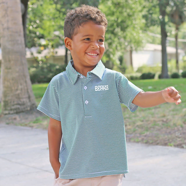Show your team spirit in style with our Hunter Stripe Polo. Designed for comfort and durability, this short sleeve knit stripe polo is not only perfect for football season playtime but also offers versatility for various occasions. Whether you're cheering from the sidelines or enjoying a casual outing, this polo keeps you looking sharp and feeling comfortable. Take it a step further and personalize the look by adding a monogram, making it uniquely yours!