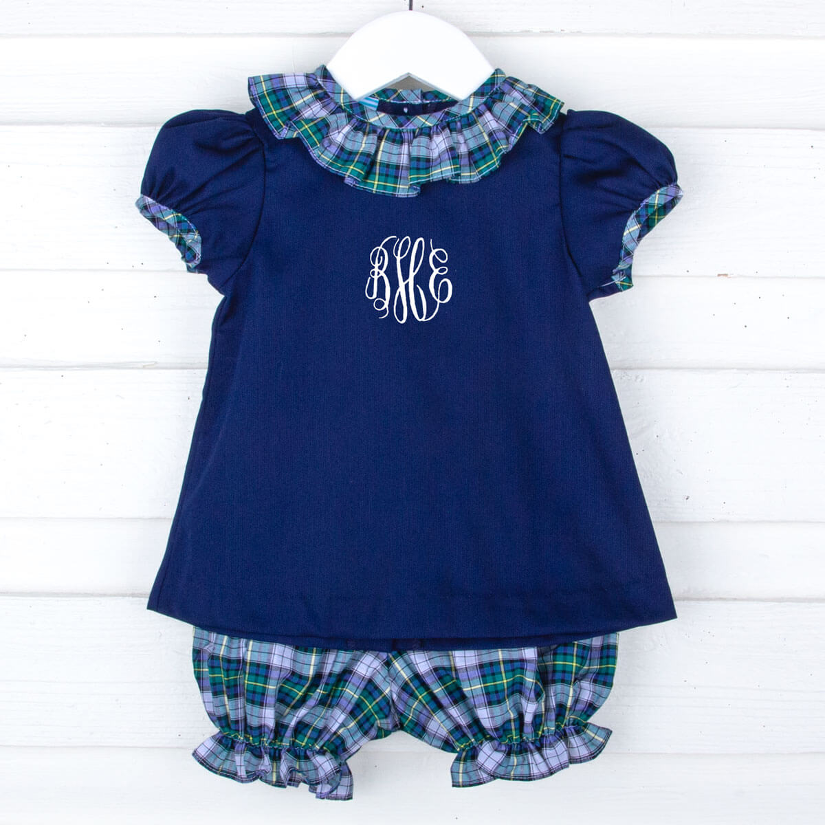 Our Brighton Plaid Collar Navy Pique Bloomer Set is a timeless choice for Fall and Winter! The navy pique top features a navy and green plaid ruffle collar for an extra beautiful touch. It's perfectly coordinated with navy and green plaid bloomers. Add a monogram to make it uniquely yours